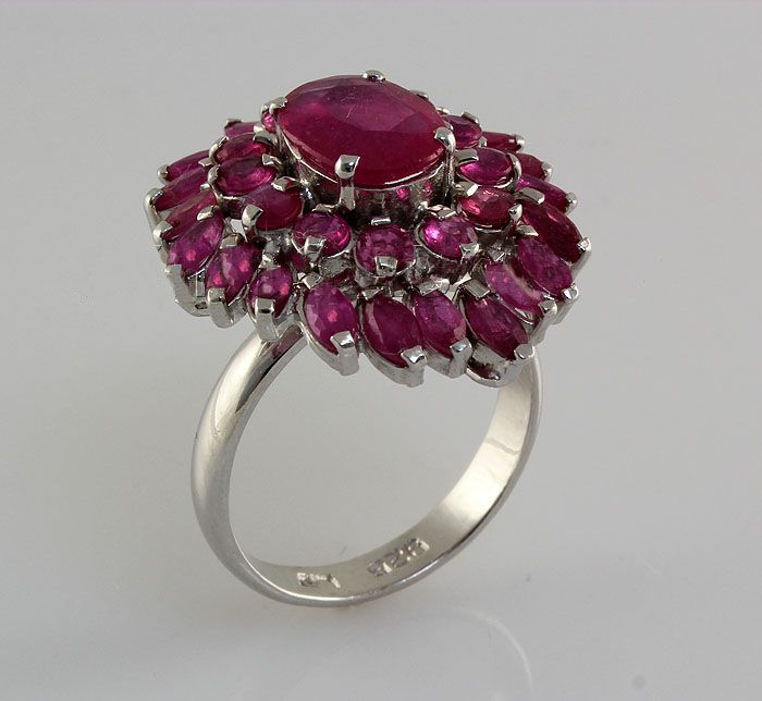 34.73CTW Pretty Pink Ruby Stone in Silver Ring **|**|** Unique Flower Design Pink Ruby Silver Ring; Size: oval 10x8mm*round 3mm*mq 4x2mm; ctw: 7.55; stone count: 33; gram weight: 5.44; ring size: 8.5 ; MSRP: $600