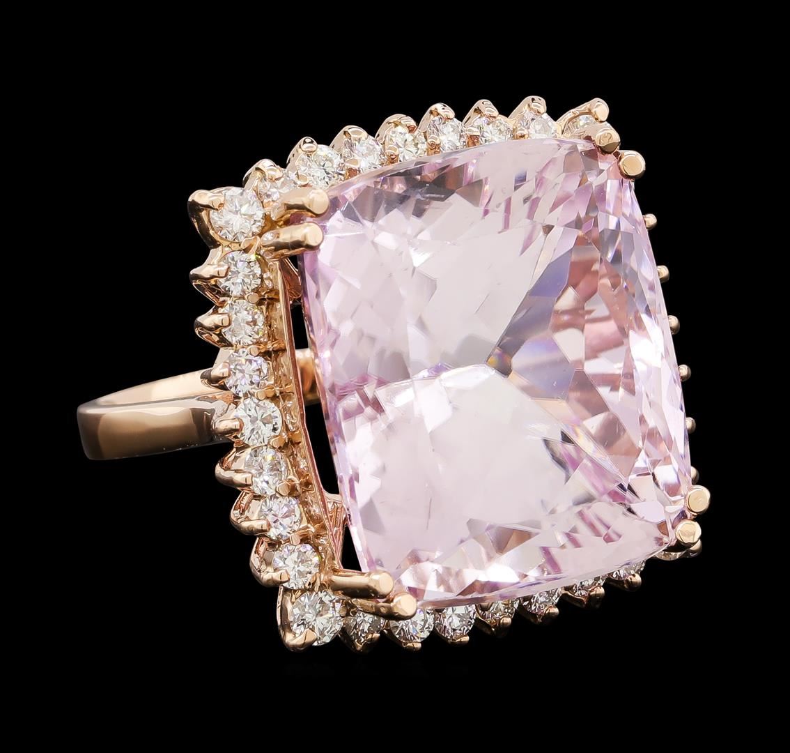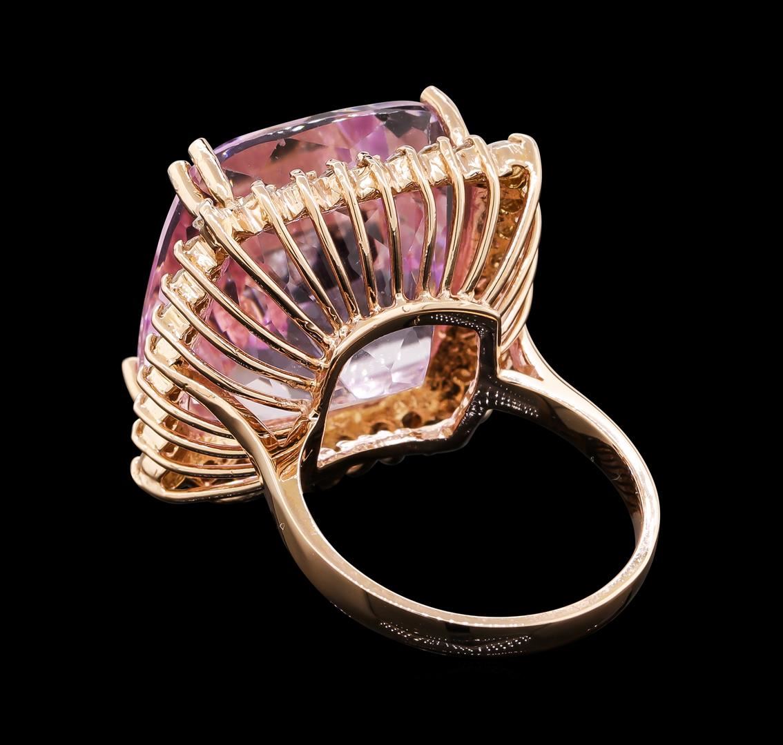 One electronically tested 14KT rose gold lady's cast fashion ring with a basket halo with a bright polish finish. The featured lady's ring has a shank measuring 2.48 millimeters wide. Identified with markings of 'K14'. Condition is new, good workmanship. Containing: One prong set rectangular cushion modified brilliant cut natural kunzite, measuring 19.01 x 16.65 x 13.83mm, (depth est.) 6%. bulge factor, approximate weight of 34.86ct., clarity is eye clean, light, moderately strong, reddish purple color, (GIA rP 3/4), cut is good. Transmitting light with no distortion, transparent. Colored gemstones are presumed to have been subjected to commonly used enhancement processes. Graded in the setting. Four prong set round brilliant cut diamonds, measuring 2.40 - 2.35 x 1.45mm (depth est.) approximate total weight of 4 Stones = 0.20ct. Graded in the setting. Clarity SI-1 to SI-2. Color: H - I Cut Good Twenty-Eight prong set round brilliant cut diamonds, measuring 2.00 - 1.95 x 1.23mm (depth est.) approximate total weight of 28 Stones = 0.82ct. Graded in the setting. Clarity SI-1 to SI-2. Color: H - I Cut Good. Total Weight of Colored Stones 34.86ct.. Total Weight of Diamonds 1.02ct.. Total Weight of Ring 14.70gm. GAS Appraised at $13,690.00.