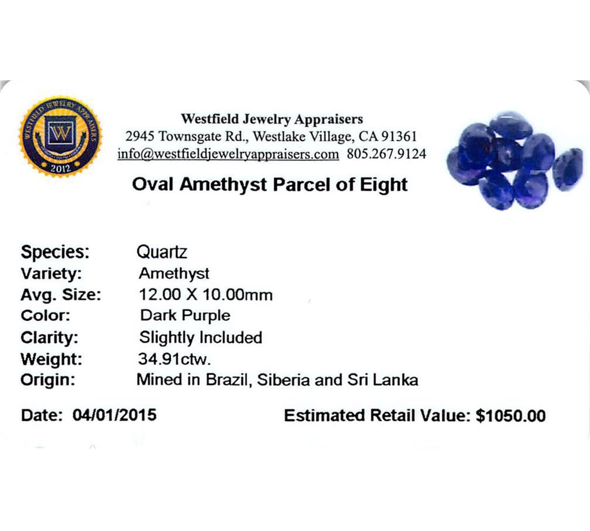 Eight oval mixed cut natural amethysts exact total weight 34.91ct., clarity is slightly included, type II, dark, very slightly grayish, purple color, (GIA P 7/3), cut is good. Westfield Appraised at $1,050.00.