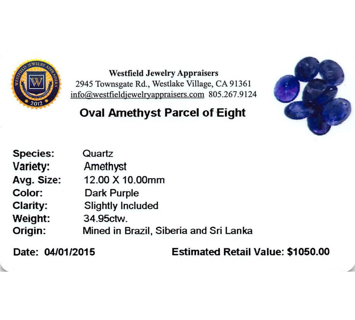 Eight oval mixed cut natural amethysts exact total weight 34.95ct., clarity is slightly included, type II, dark, very slightly grayish, purple color, (GIA P 7/3), cut is good. Westfield Appraised at $1,050.00.