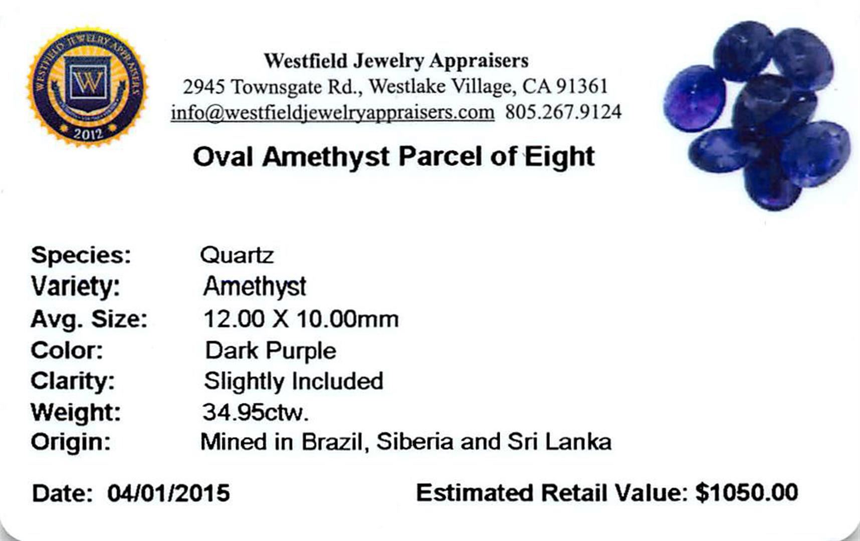 Eight oval mixed cut natural amethysts exact total weight 34.95ct., clarity is slightly included, type II, dark, very slightly grayish, purple color, (GIA P 7/3), cut is good. Westfield Appraised at $1,050.00.