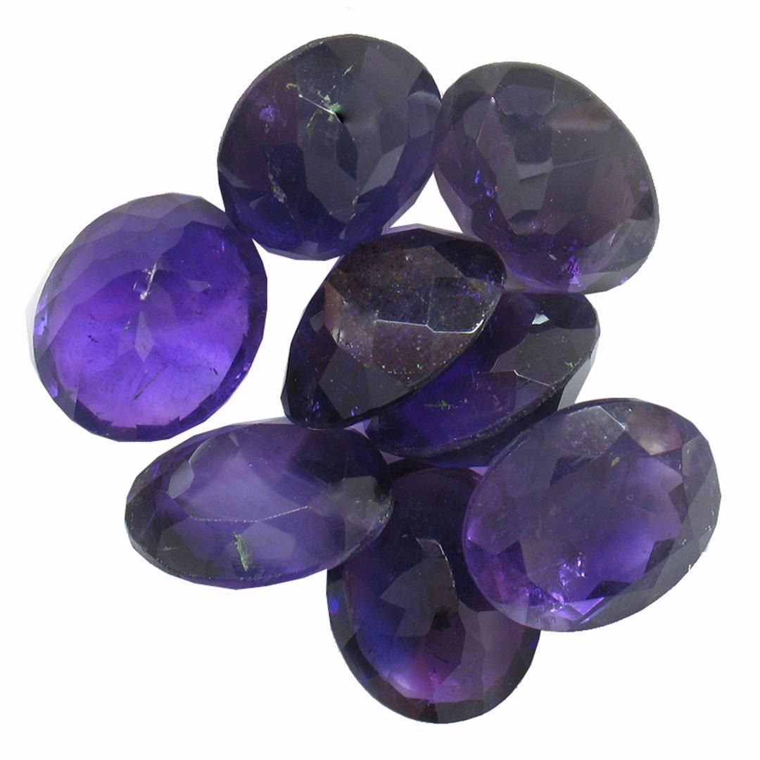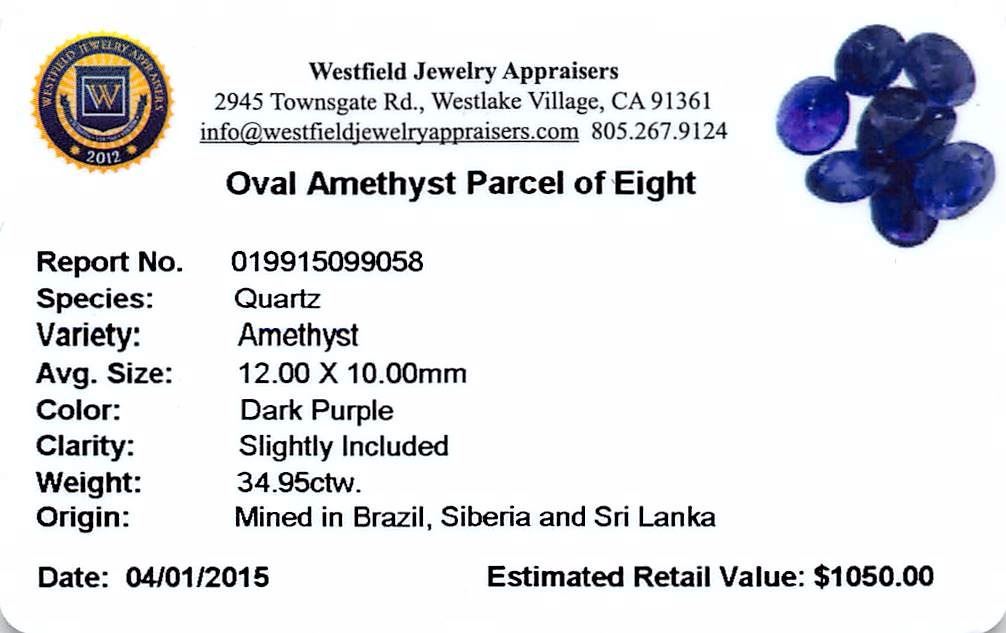 Eight oval mixed cut natural amethysts exact total weight 34.95ct., clarity is slightly included, type II, dark, very slightly grayish, purple color, (GIA P 7/3), cut is good. Westfield Appraised at $1,050.00.
