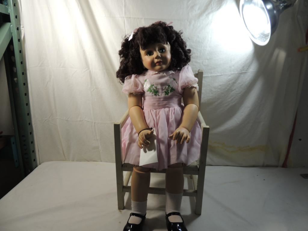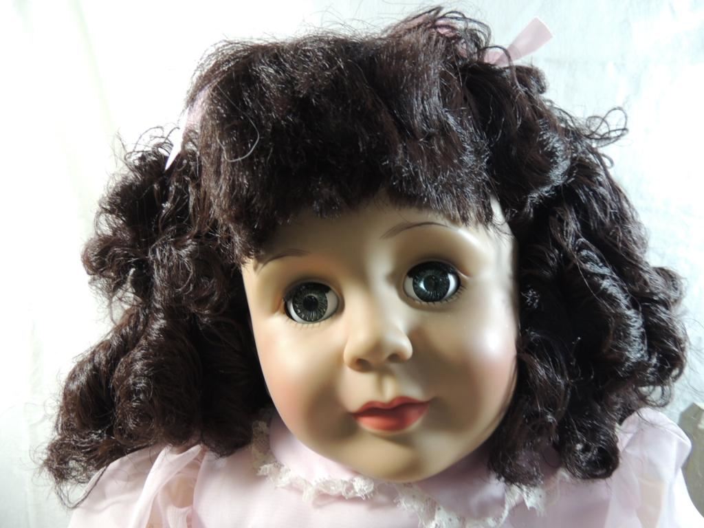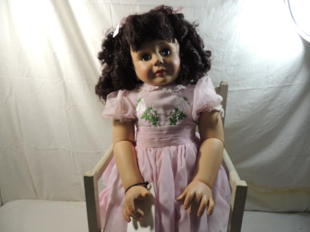 RETIRED ASHTON DRAKE REPRODUCTION DOLL, BROWN CURLY HAIR PINK BABY DOLL DRESS SLEEP EYES. GREAT CONDITION COLLECTIBLE LARGE DOLL CHAIR NOT INCLUDED AS SHOWN SEE PHOTO FOR MORE DETAILS
