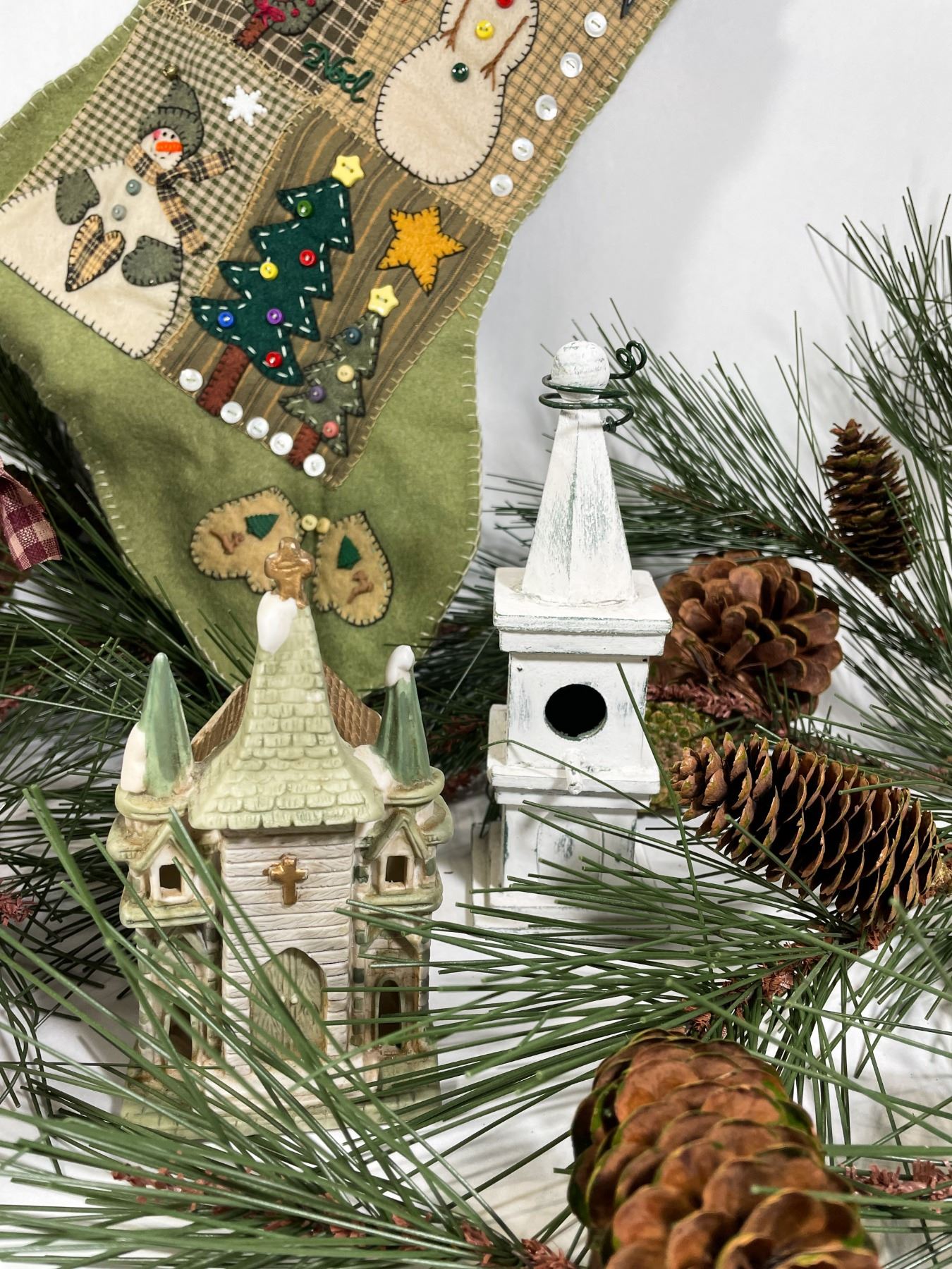 HAND MADE CHRISTMAS STOCKING 23" T X 11"W, PINE CONE BASKET 9" W X 7" T, LARGE PINE CONE 7" TALL, VARIOUS DÉCOR + 36" GREENERY***ITEM(S) LOCATED IN LETHBRIDGE ALBERTA. ALL ITEMS IN THIS AUCTION QUALIFY FOR OUR FREE TRANSPORT TO EDMONTON SERVICE. WORLDWIDE SHIPPING AVAILABLE