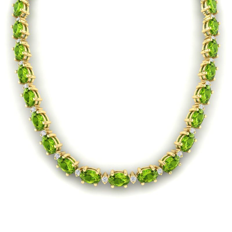 REF-213W6F -21600 ---- 34 CTW Peridot & VS/SI Diamond Tennis Necklace White 10K Yellow Gold ---- Luxury Designer Brand Necklace Appraised at $15,300 Certificate Number US21600 10k Yellow gold, Necklace Size is 16 Inches, Necklace measuring approx. 4 mm X 16 inches , weighing in total approx. 16 grams. Made in the USA and is stamped 10k, Main stone 33 carat total weight containing 45 pieces of Intense Green color with AAA quality Oval shape cut Peridot , Stone #2 1 carat total weight containing 45 pieces of H-I color with VS/SI quality Round shape cut Diamond