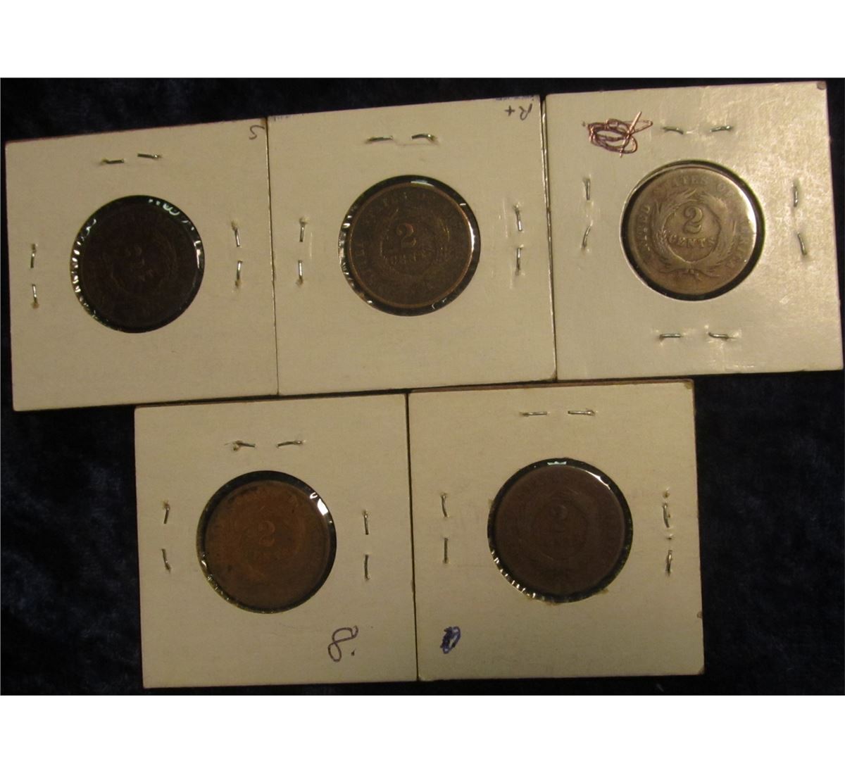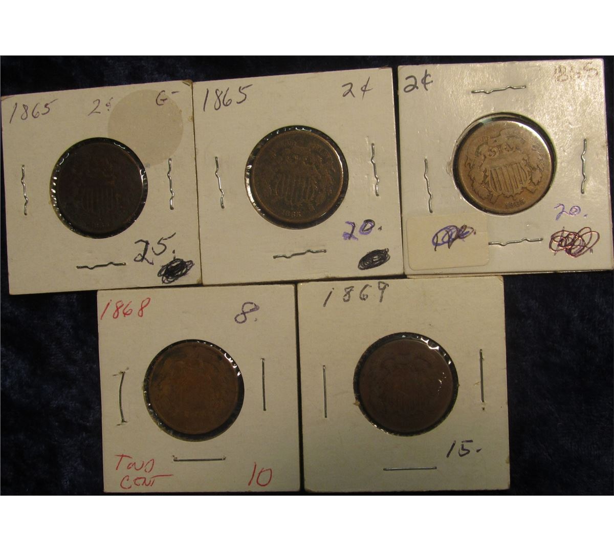 34. Hoard of U.S. Two Cent Pieces: (3) 1865, 1868, & 1869. Good to Very Good.