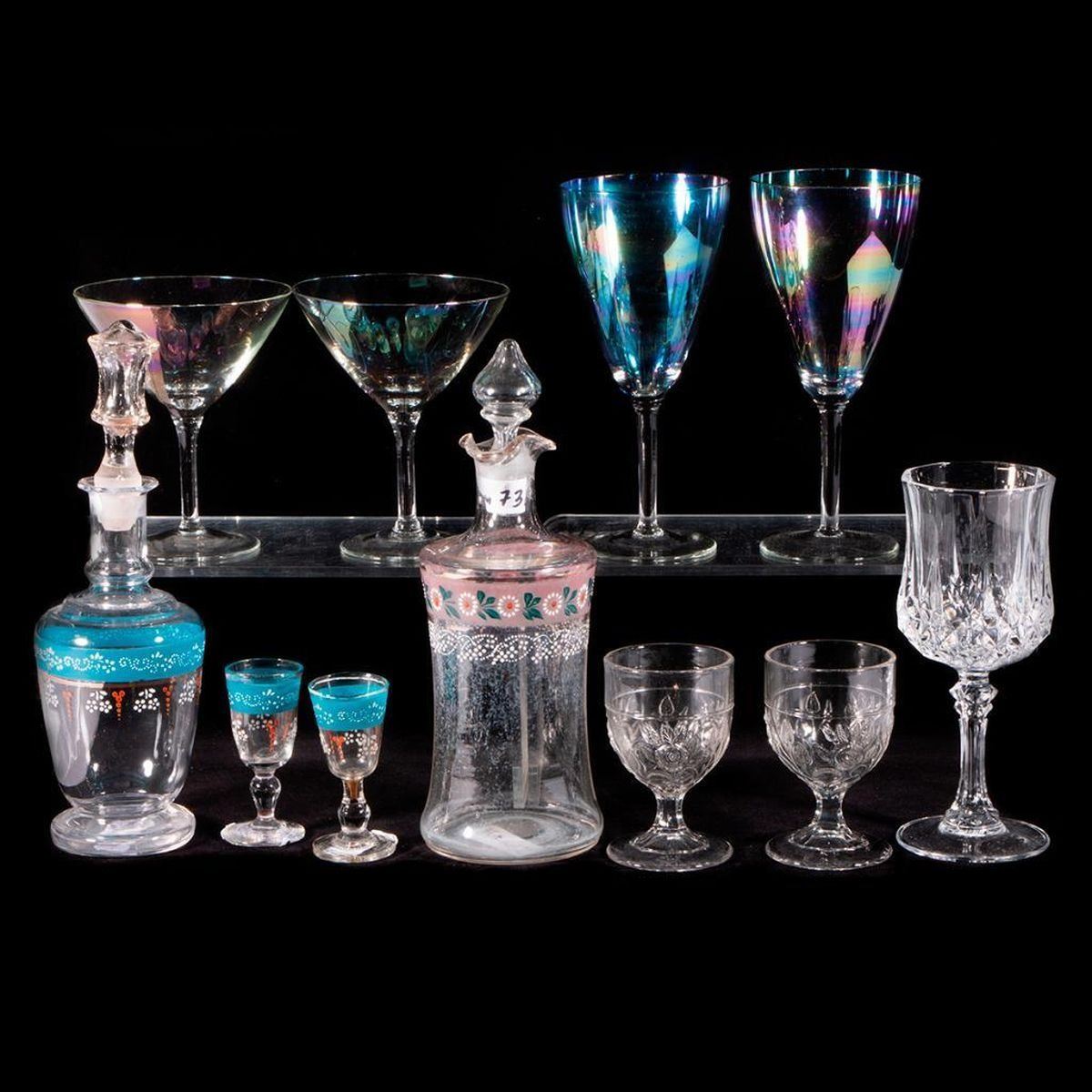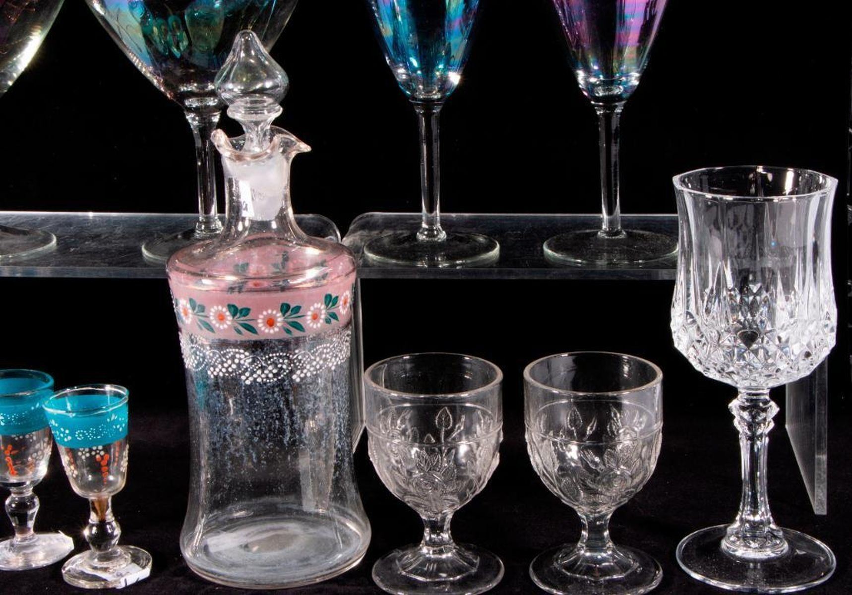 34 pieces of vintage and antique glassware including 9 early American pressed glass wine glasses, 7 martini stemware, 10 stemware, 2 crystal wine glasses, 2 decanters with 3 liqueur glasses, and a frosted apple. Items are sold as is. Please inquire about condition if not otherwise stated.