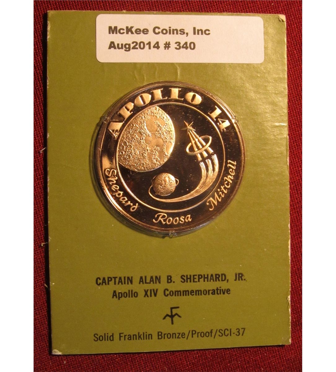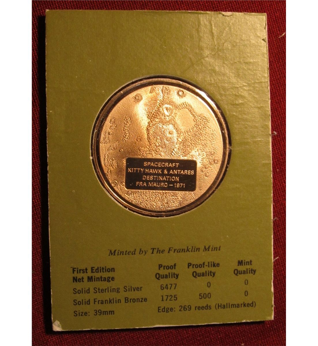 340. "Apollo 14 Shepard Roosa Mitchell" Proof Bronze Medal. 1 1/2" diameter. In original holder as issued by the Franklin Mint. Only 1,725 ever minted. Very rare.