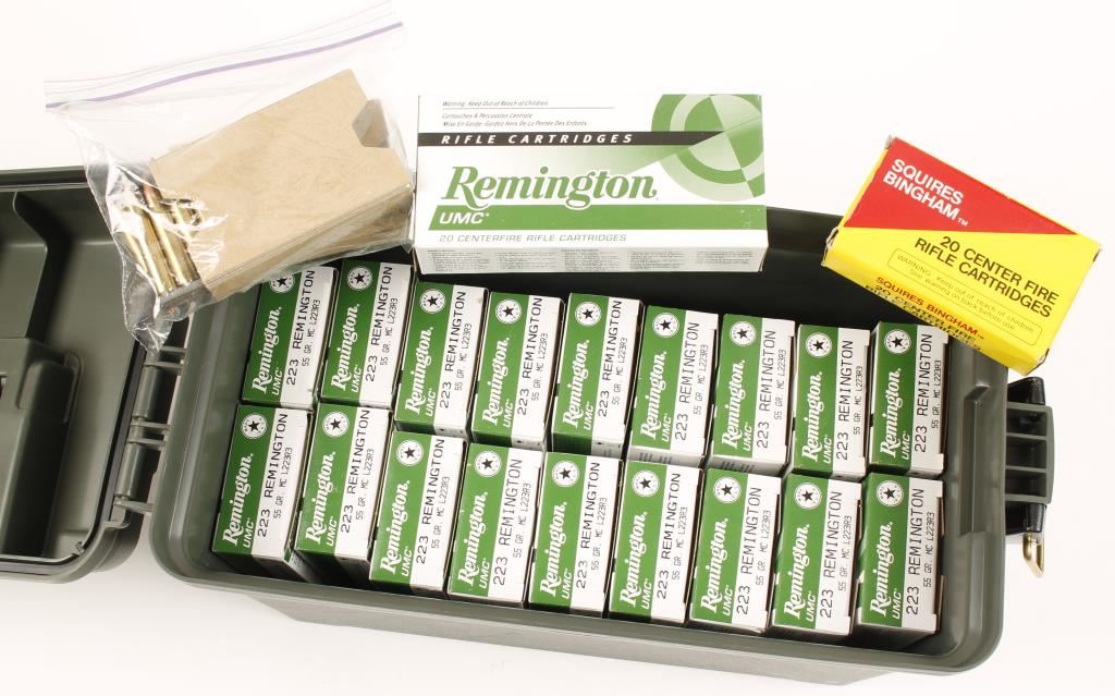 280 Rounds of 55 grain Remington UMC in 20 round boxes, 20 rounds of Squires Bingham 55 grain fmj, 40 rounds in 10 round stripper clips in a Cabela's ammo canister.