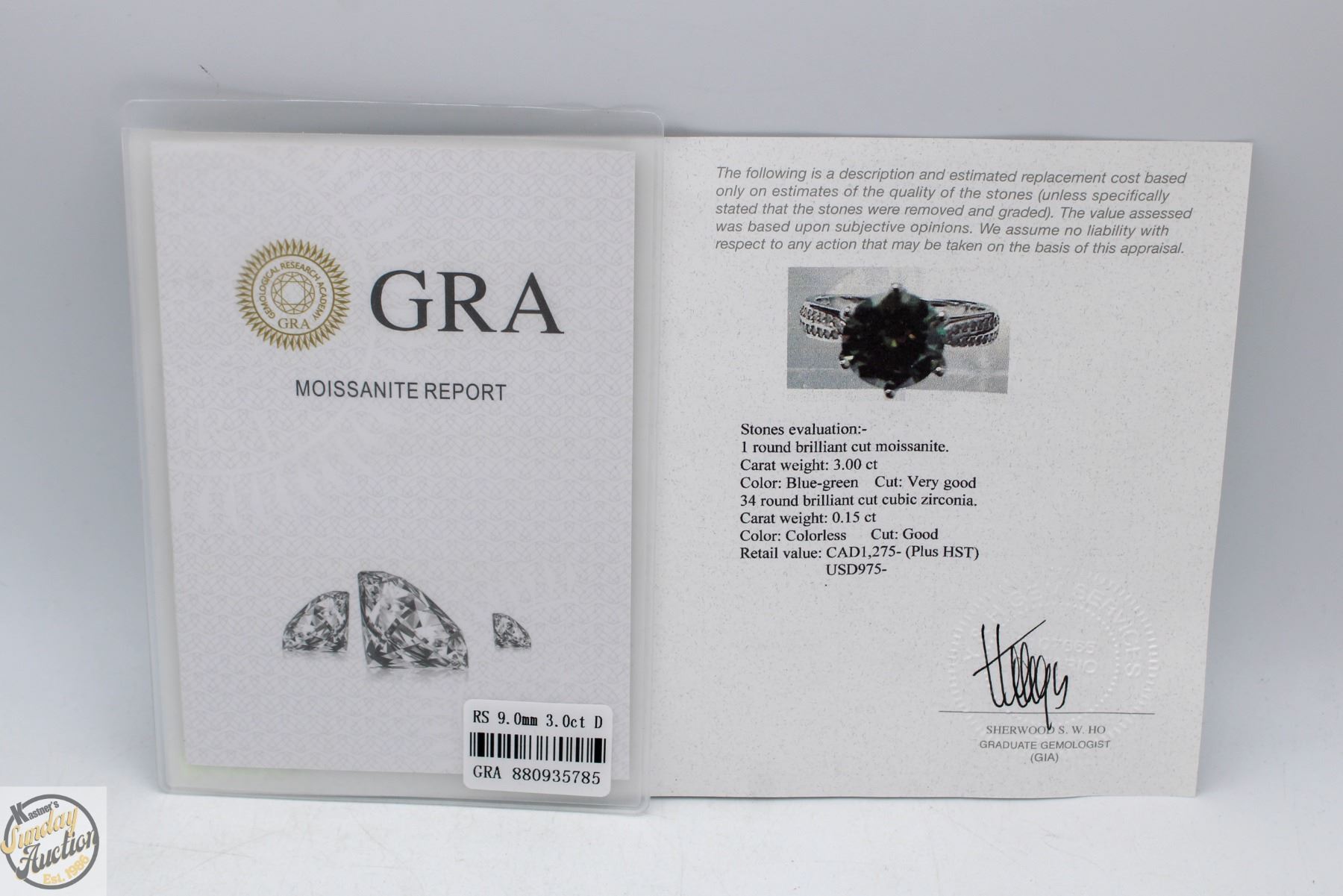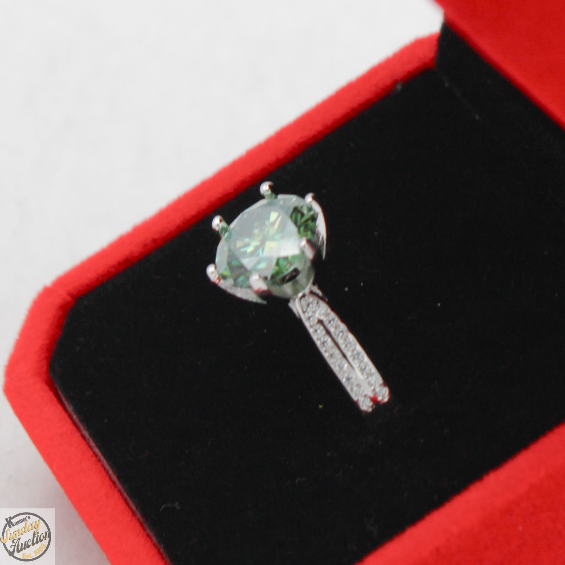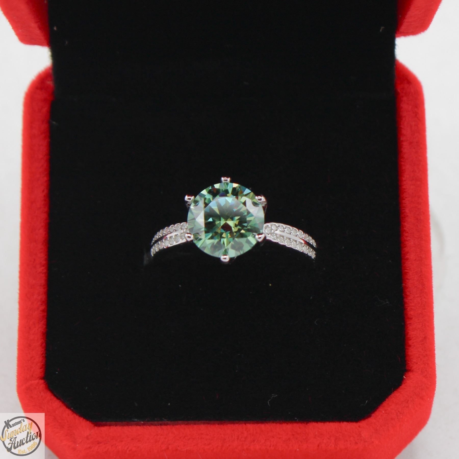 MOISSANITE STONE VVS BLUISH GREEN COLOR WITH 34 ROUND BRILLIANT CUT CUBIC ZIRCONIA SET IN SHANKS SET IN 925 SILVER RING SIZE 7 RETAIL VALUE $1,275.00 **ALL ITEMS MUST BE REMOVED BY 5PM SATURDAY, DECEMBER 6TH 2025. ALL REMAINING ITEMS WILL BE SUBJECT TO A $6.00 PER DAY STORAGE CHARGE. ANY ITEMS REMAINING AFTER MONDAY, DECEMBER 22ND 2025 WILL BE CONSIDERED FORFEITED. NO REFUNDS WILL BE ISSUED FOR FORFEITED ITEMS. TO SCHEDULE A PICK UP APPOINTMENT CLICK HERE