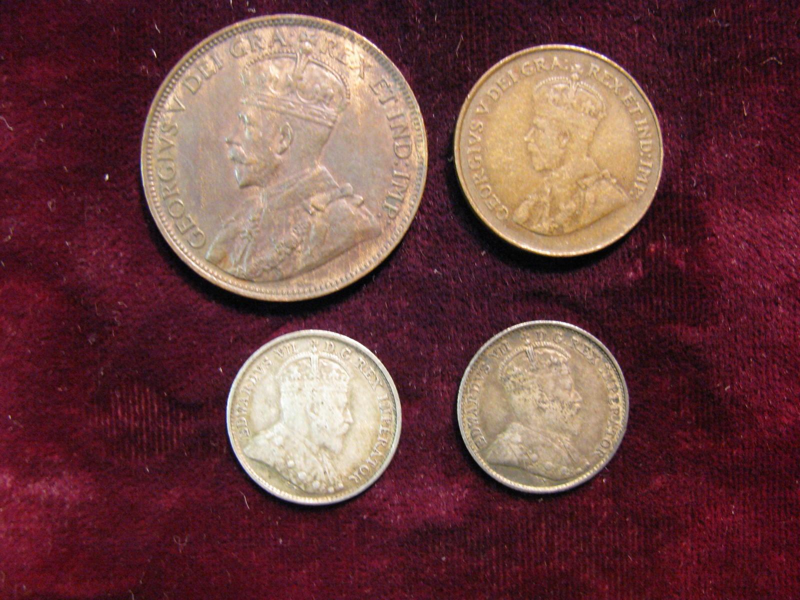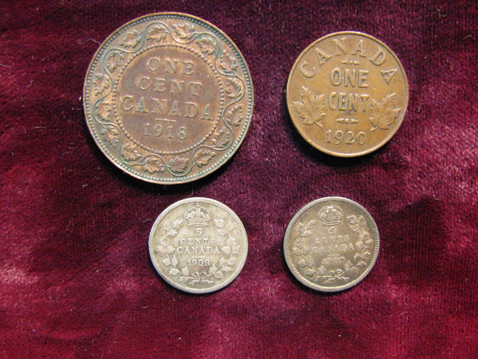 3402. Canada 1918 & 20 Cents VF-EF, 1908 & 09 5-Cents VG.