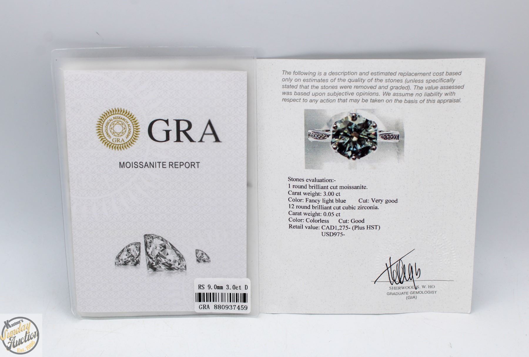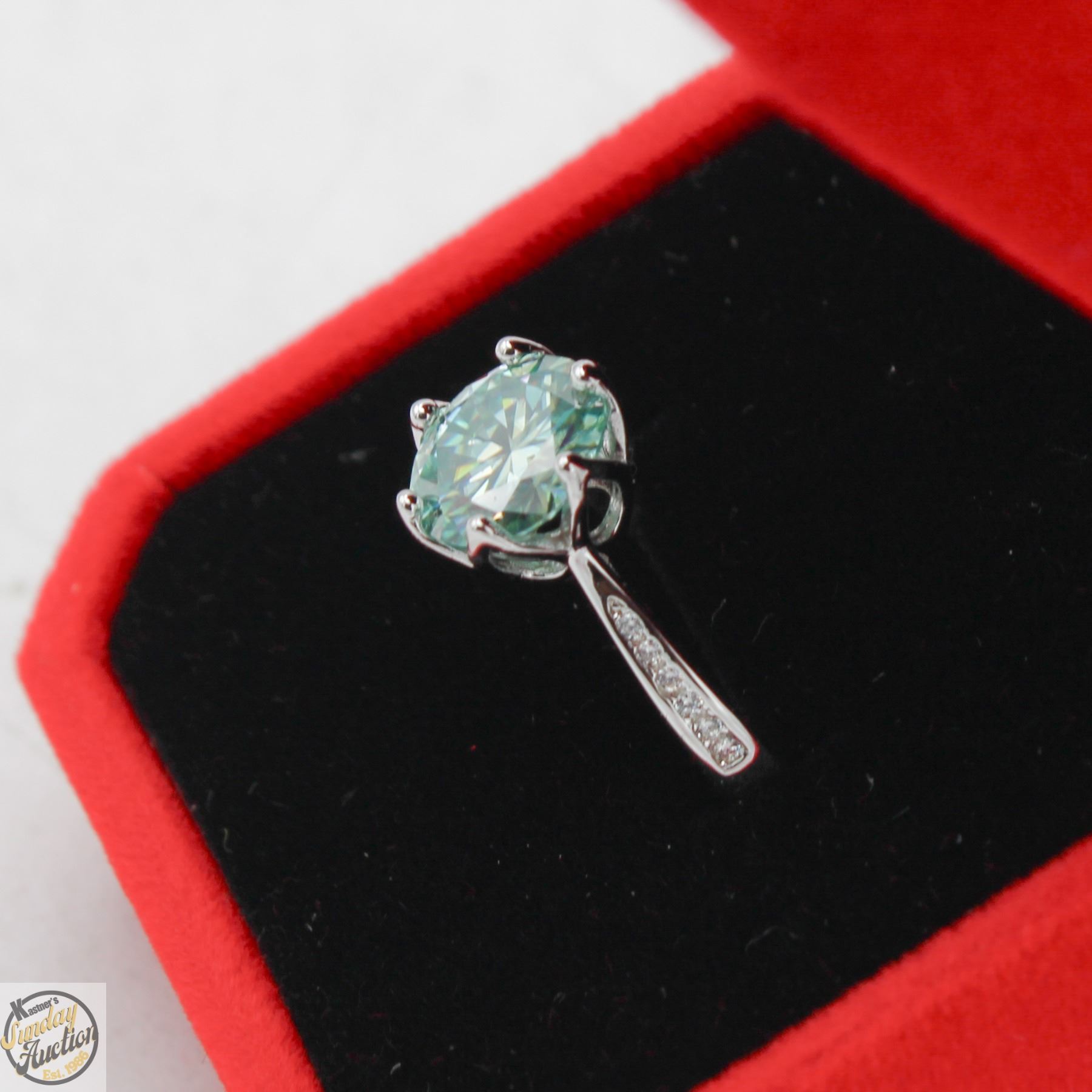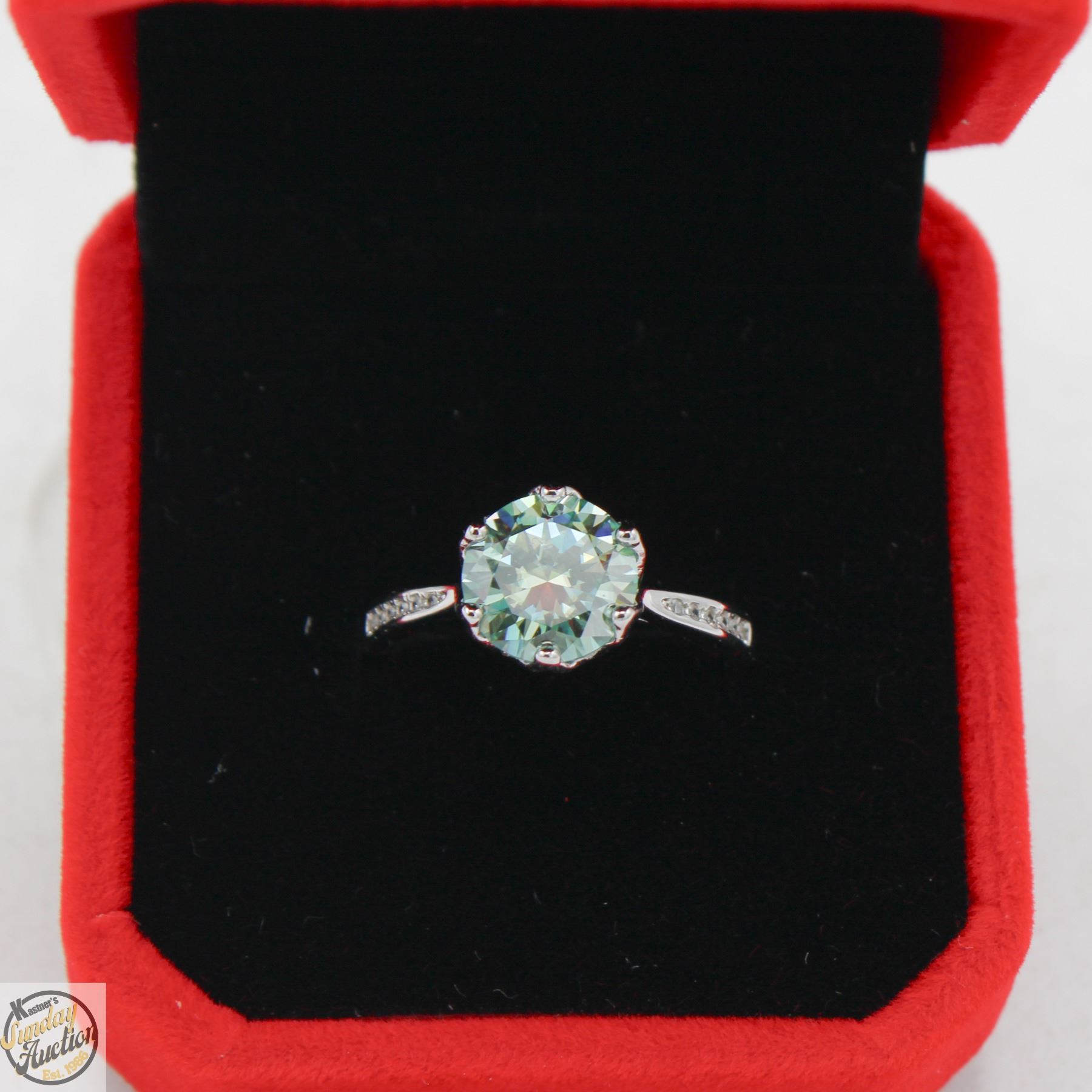 MOISSANITE STONE VVS FANCY LIGHT BLUE COLOR WITH 12 ROUND BRILLIANT CUT CUBIC ZIRCONIA SET IN SHANKS SET IN 925 SILVER RING SIZE 7.25 RETAIL VALUE $1,275.00 **ALL ITEMS MUST BE REMOVED BY 5PM SATURDAY, DECEMBER 6TH 2025. ALL REMAINING ITEMS WILL BE SUBJECT TO A $6.00 PER DAY STORAGE CHARGE. ANY ITEMS REMAINING AFTER MONDAY, DECEMBER 22ND 2025 WILL BE CONSIDERED FORFEITED. NO REFUNDS WILL BE ISSUED FOR FORFEITED ITEMS. TO SCHEDULE A PICK UP APPOINTMENT CLICK HERE