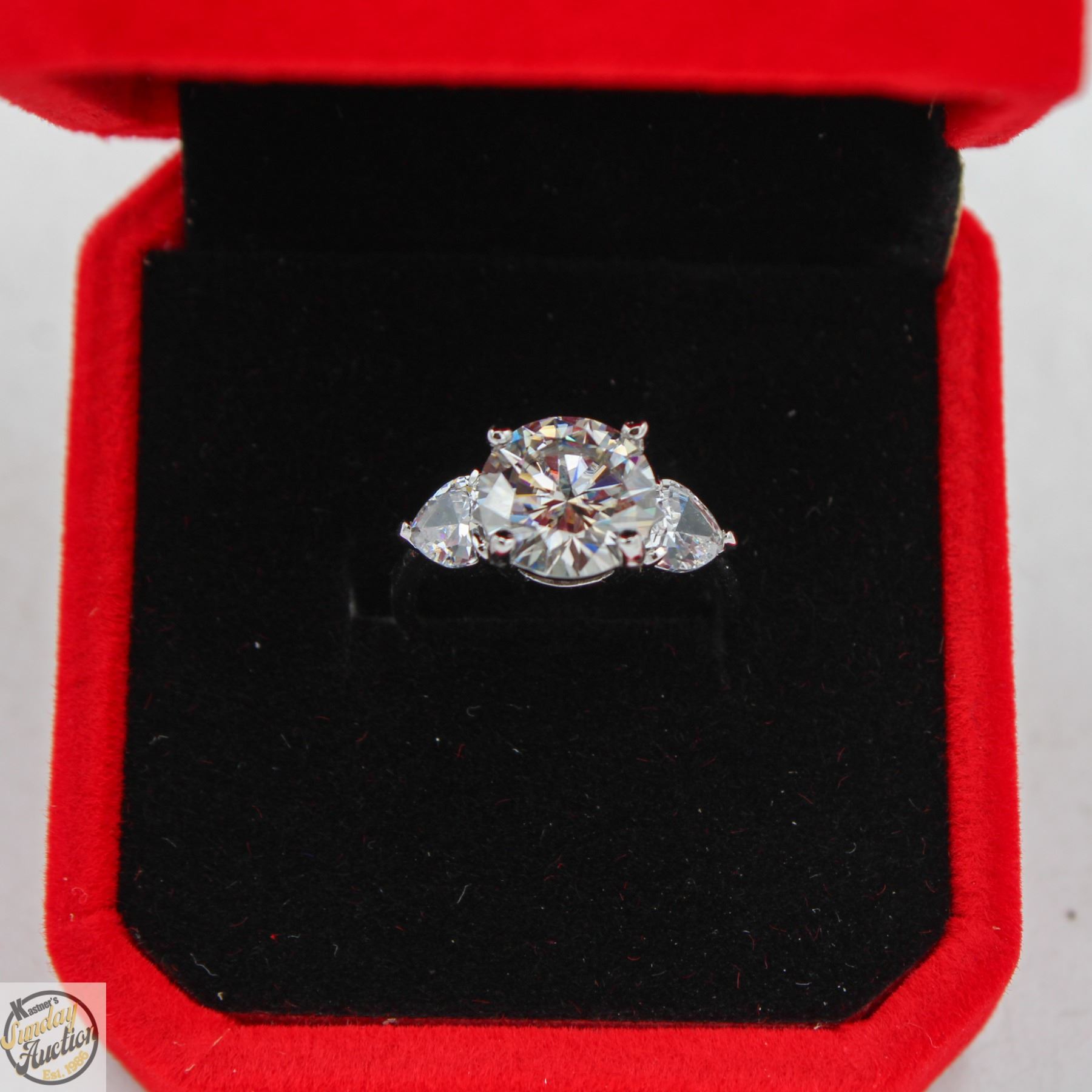 MOISSANITE STONE VVS D COLOR SET IN CENTER WITH HEART SHAPED BRILLIANT CUT CUBIC ZIRCONIA SET ON EITHER SIDE SET IN 925 SILVER RING SIZE 5 RETAIL VALUE $1,225.00 **ALL ITEMS MUST BE REMOVED BY 5PM SATURDAY, OCTOBER 25TH 2025. ALL REMAINING ITEMS WILL BE SUBJECT TO A $6.00 PER DAY STORAGE CHARGE. ANY ITEMS REMAINING AFTER MONDAY, NOVEMBER 10TH 2025 WILL BE CONSIDERED FORFEITED. NO REFUNDS WILL BE ISSUED FOR FORFEITED ITEMS. TO SCHEDULE A PICK UP APPOINTMENT CLICK HERE