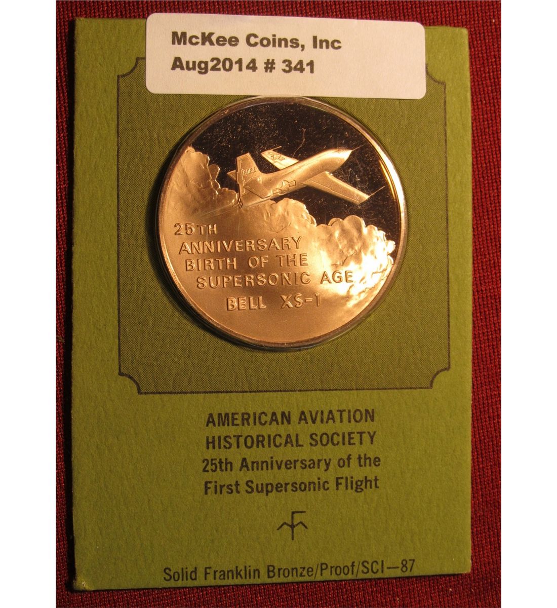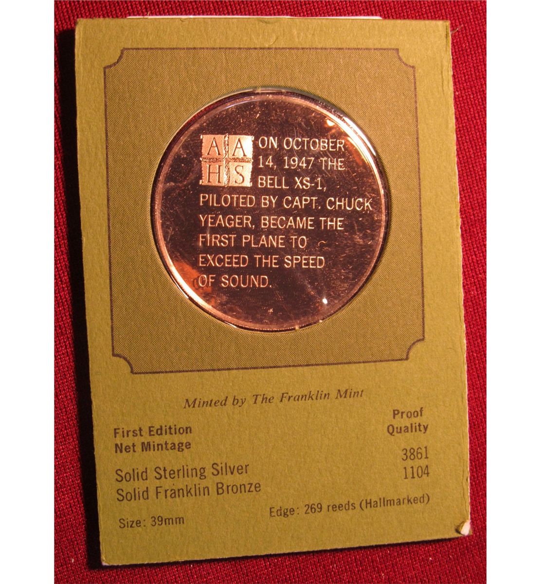 341. "25th Anniversary Birth of the Supersonic Age Bell XS-1" Proof Bronze Medal. 1 1/2" diameter. In original holder as issued by the Franklin Mint. Only 1,104 ever minted. Very rare.