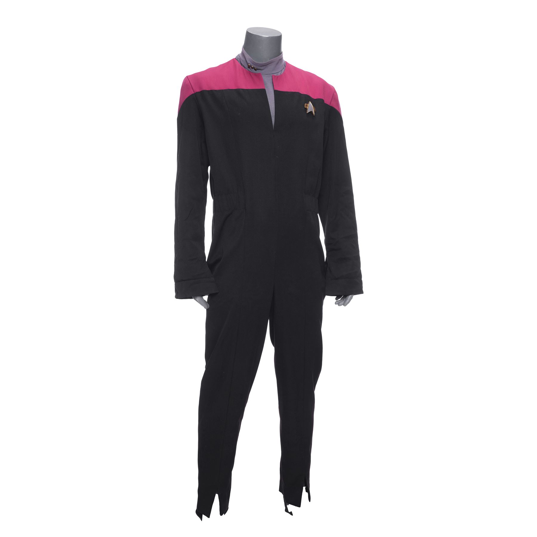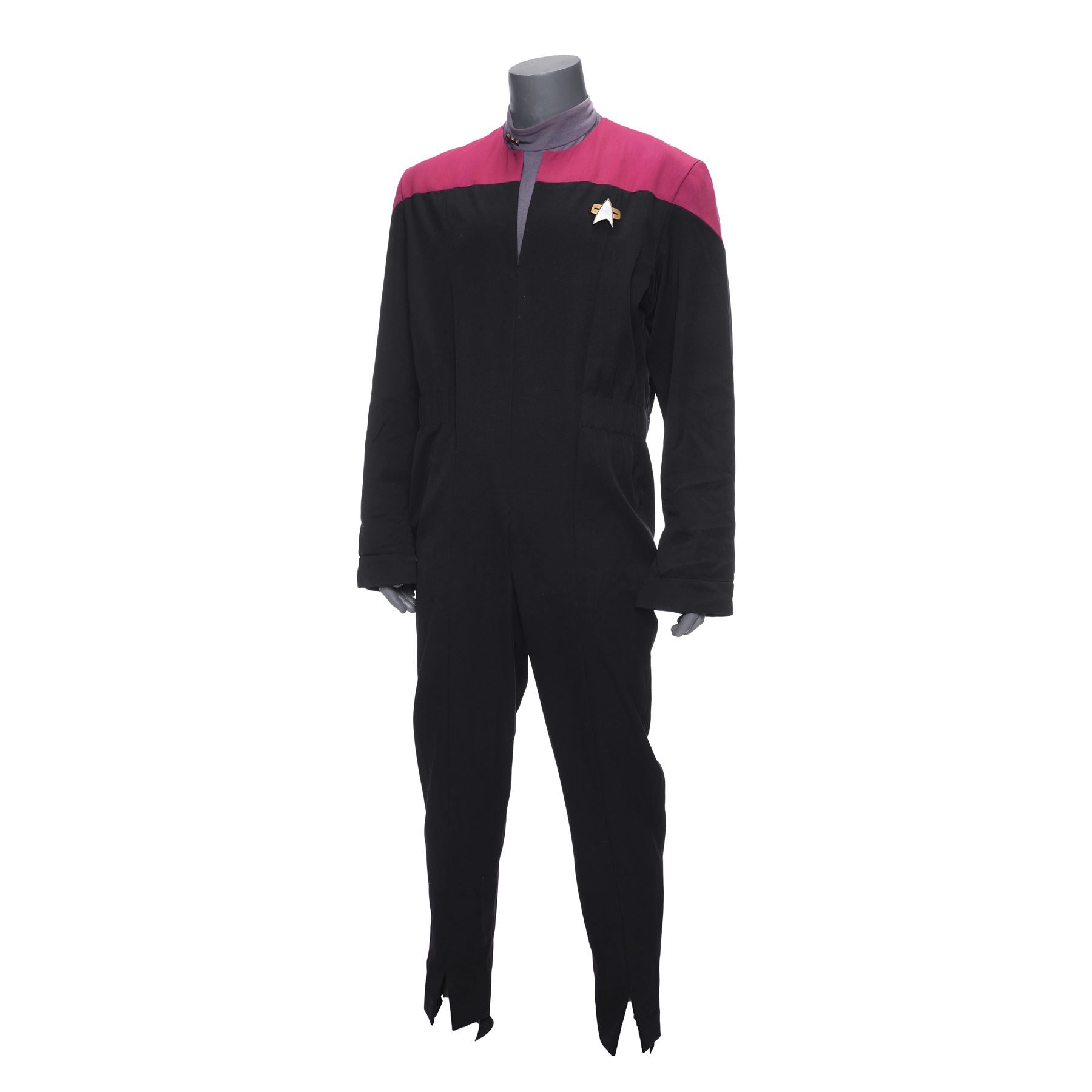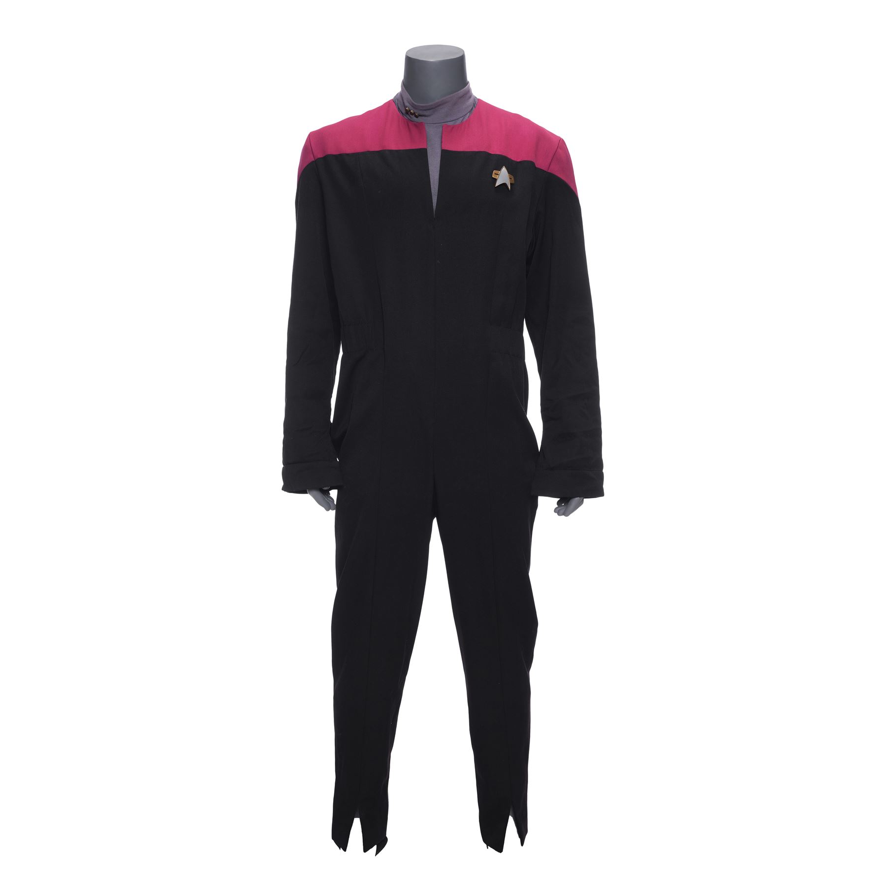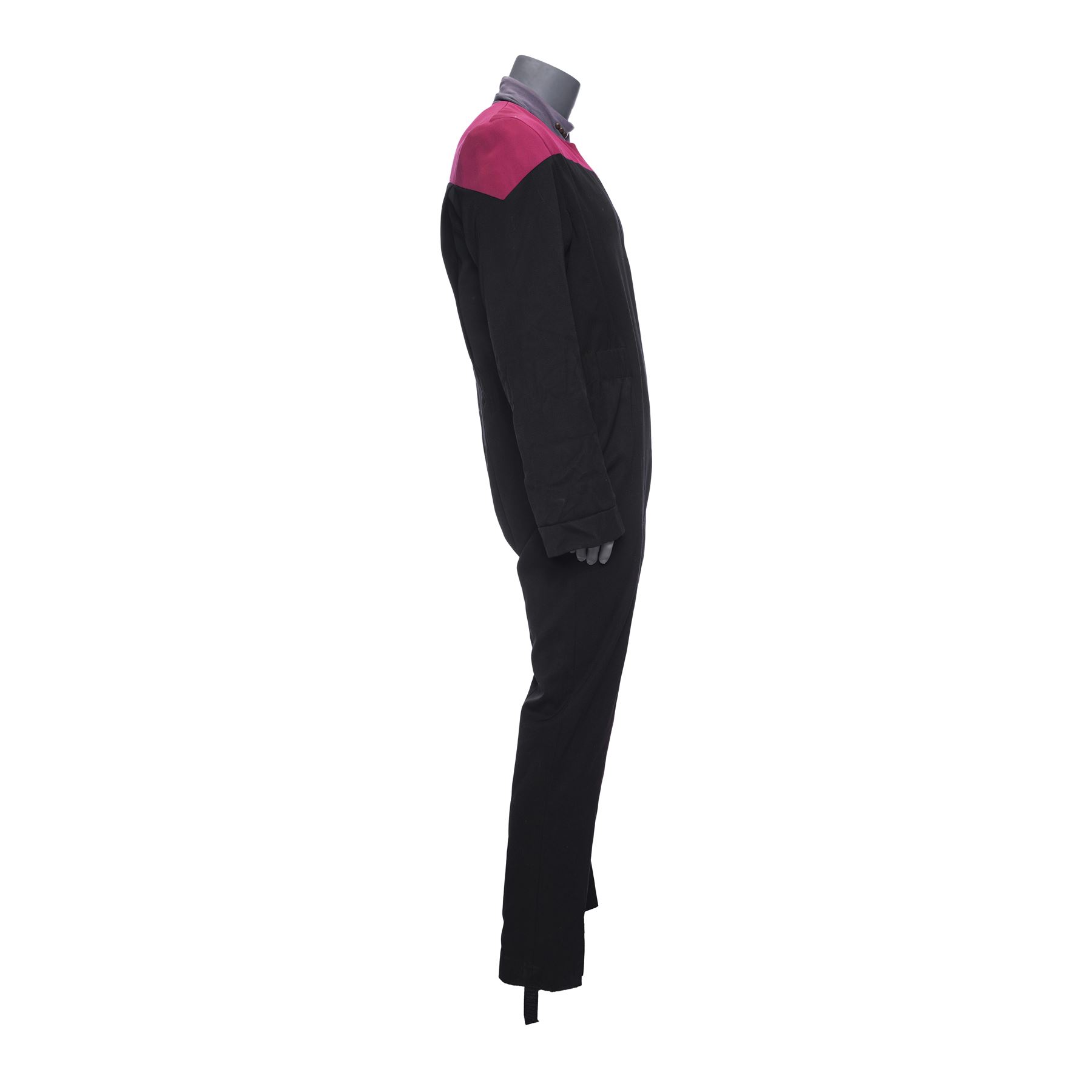This costume consists of one burgundy and black wool jumpsuit with a resin Starfleet comm badge attached by a self-adhesive strip and elastic stirrups; and one long-sleeve heather gray bodysuit with three metal rank pips attached to the collar. Both items feature zip closures, as well as a "Star Trek VII" label on the interior with "Jonathan Frakes" handwritten on them in black ink. This costume exhibits discoloration.