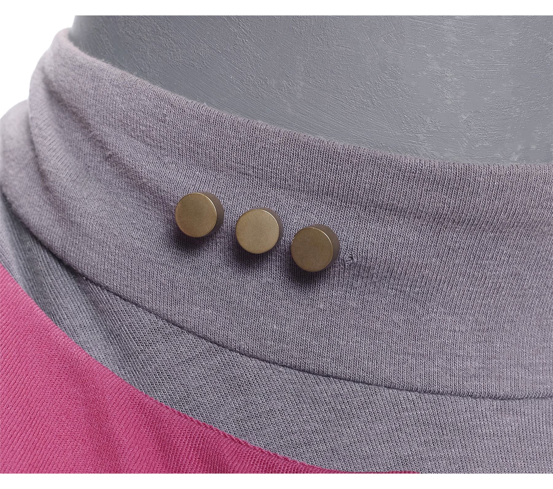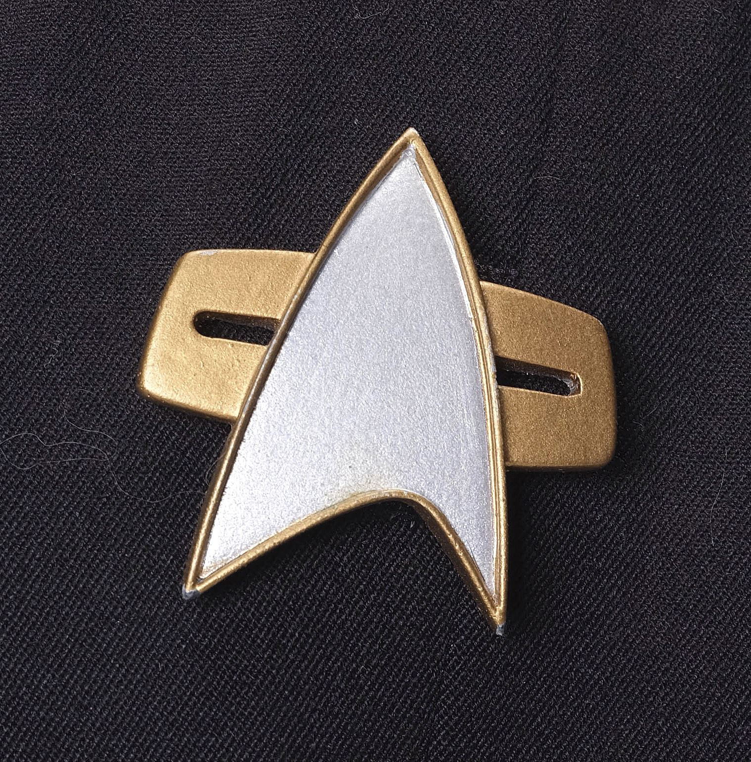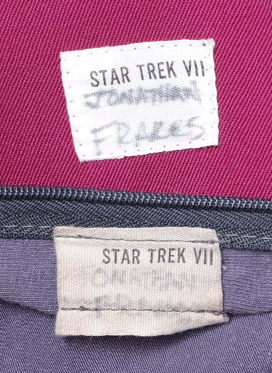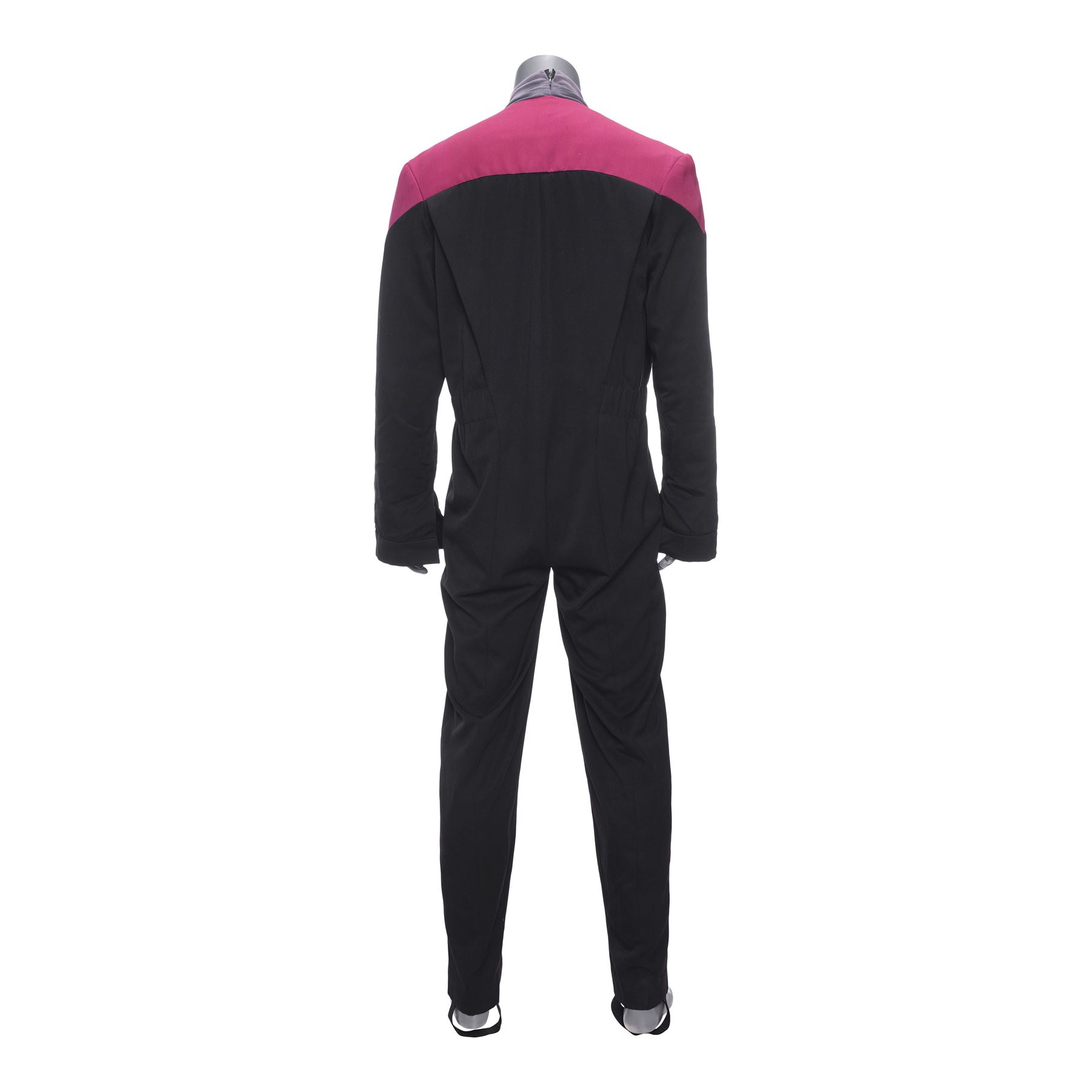 This costume consists of one burgundy and black wool jumpsuit with a resin Starfleet comm badge attached by a self-adhesive strip and elastic stirrups; and one long-sleeve heather gray bodysuit with three metal rank pips attached to the collar. Both items feature zip closures, as well as a "Star Trek VII" label on the interior with "Jonathan Frakes" handwritten on them in black ink. This costume exhibits discoloration.