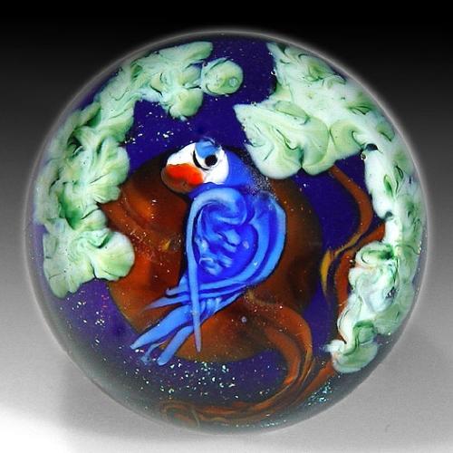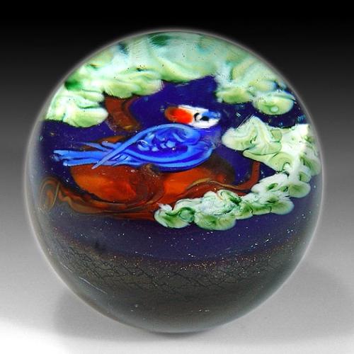David Salazar 1998 miniature parrot paperweight, with a blue parrot, perched on a tree branch, under a full moon, in an iridescent dark blue sky. Signed/dated. Diameter 1 5/8". NO RESERVE