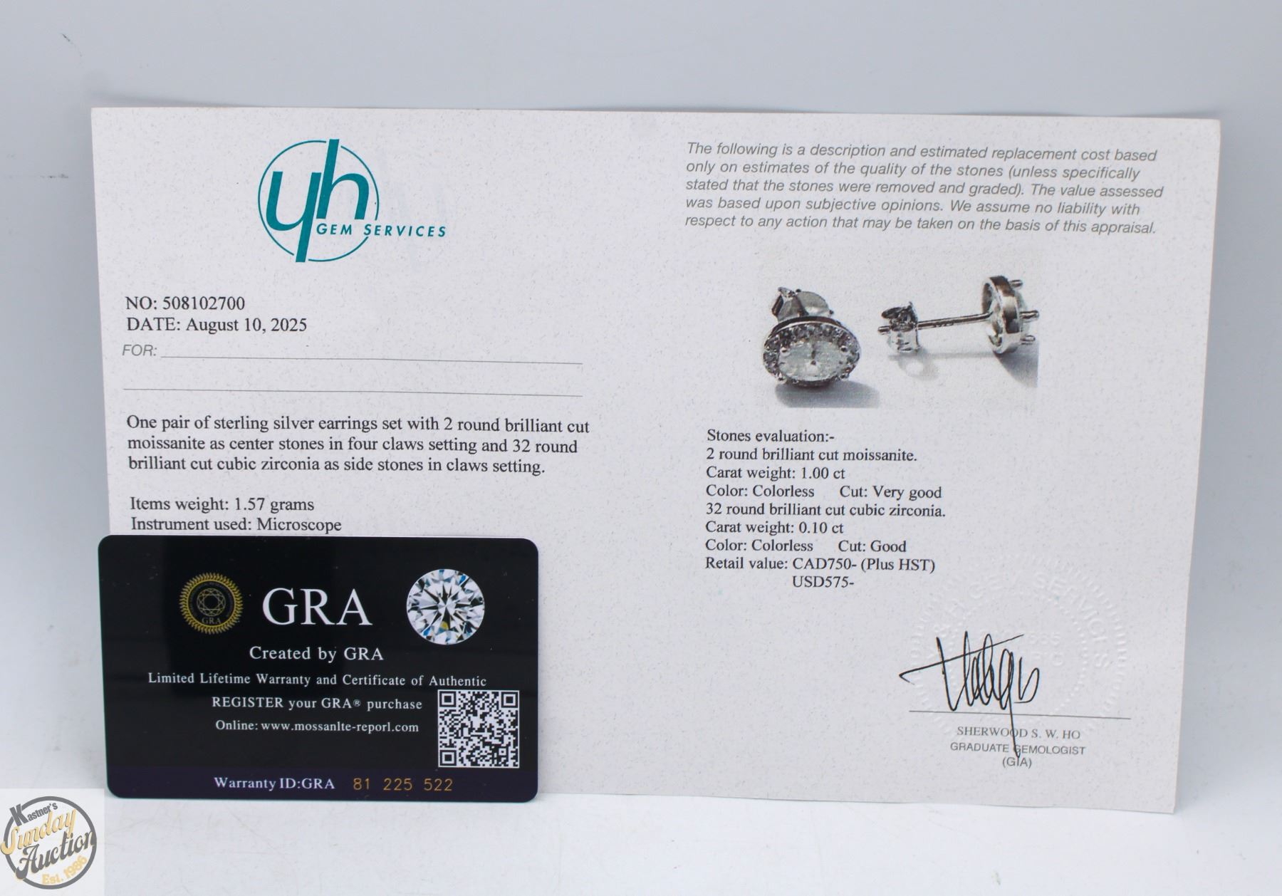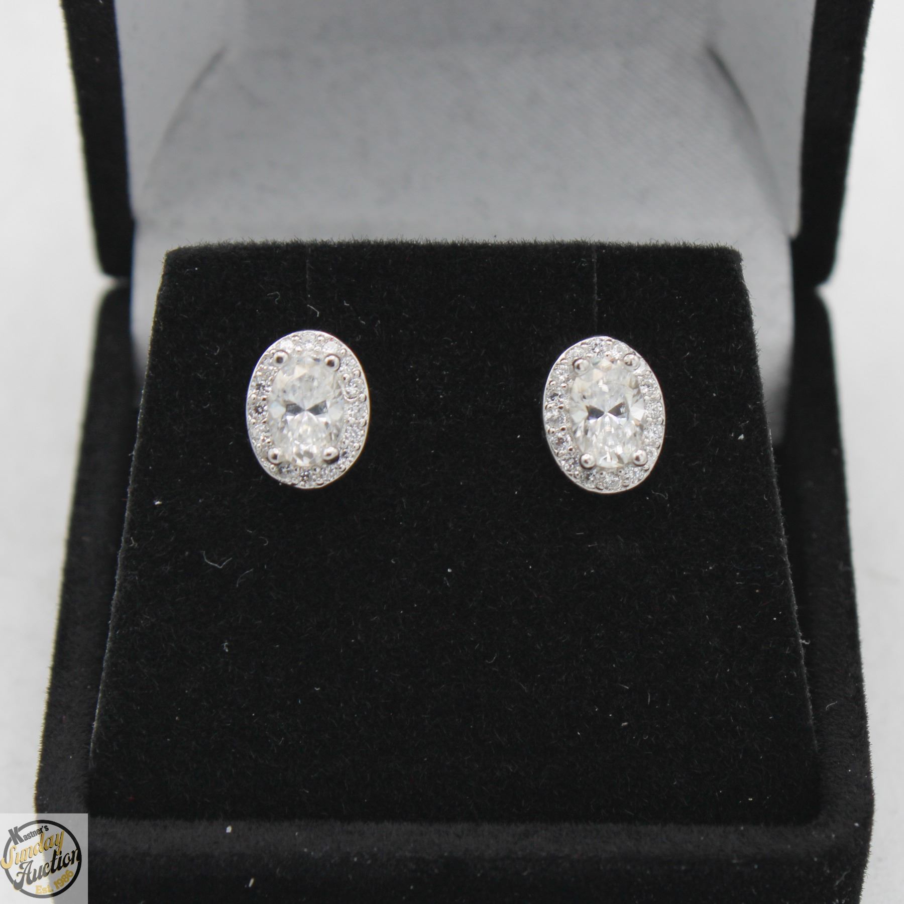 MOISSANITE STONE VVS D COLOR WITH 32 ROUND BRILLIANT CUT CUBIC ZIRCONIA SET IN OVAL HALO SET IN EARRINGS SET IN 925 SILVER RETAIL VALUE $750.00 **ALL ITEMS MUST BE REMOVED BY 5PM SATURDAY, DECEMBER 6TH 2025. ALL REMAINING ITEMS WILL BE SUBJECT TO A $6.00 PER DAY STORAGE CHARGE. ANY ITEMS REMAINING AFTER MONDAY, DECEMBER 22ND 2025 WILL BE CONSIDERED FORFEITED. NO REFUNDS WILL BE ISSUED FOR FORFEITED ITEMS. TO SCHEDULE A PICK UP APPOINTMENT CLICK HERE
