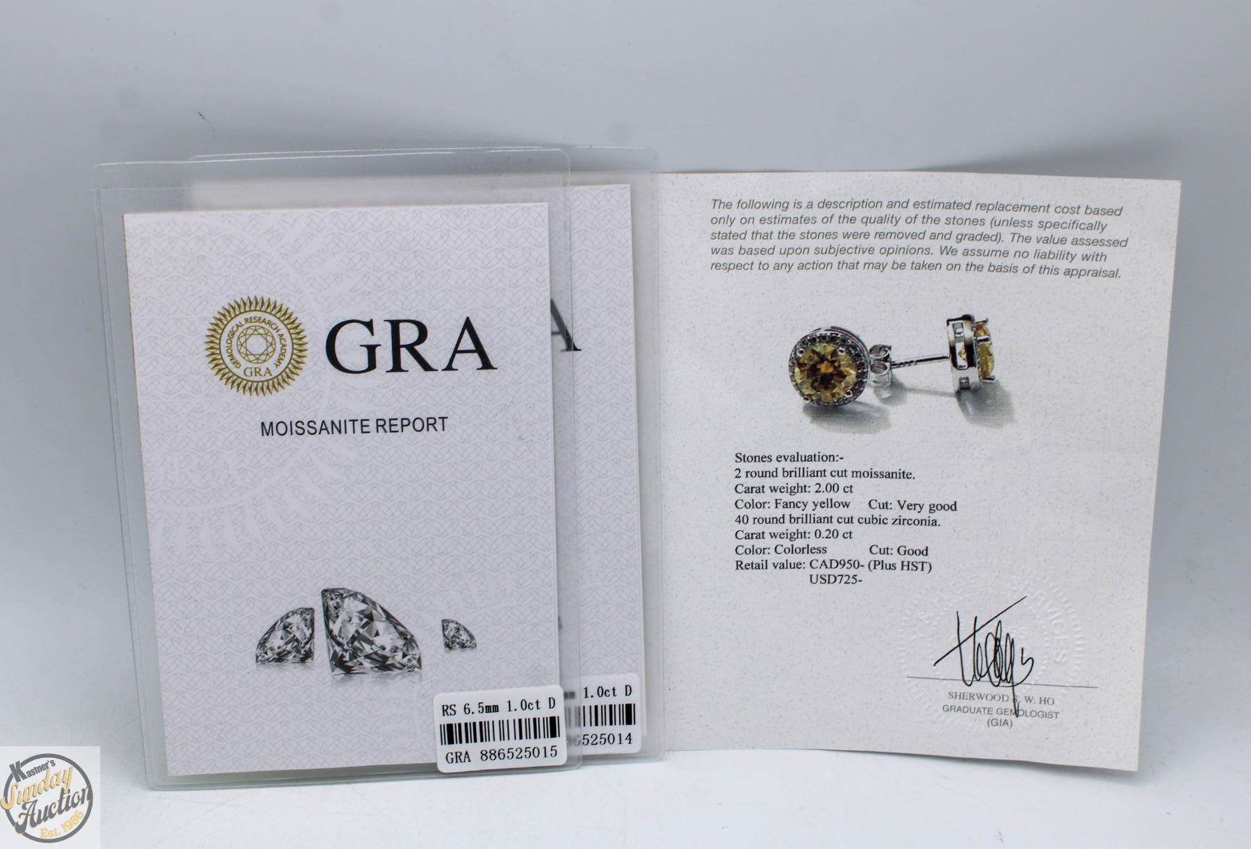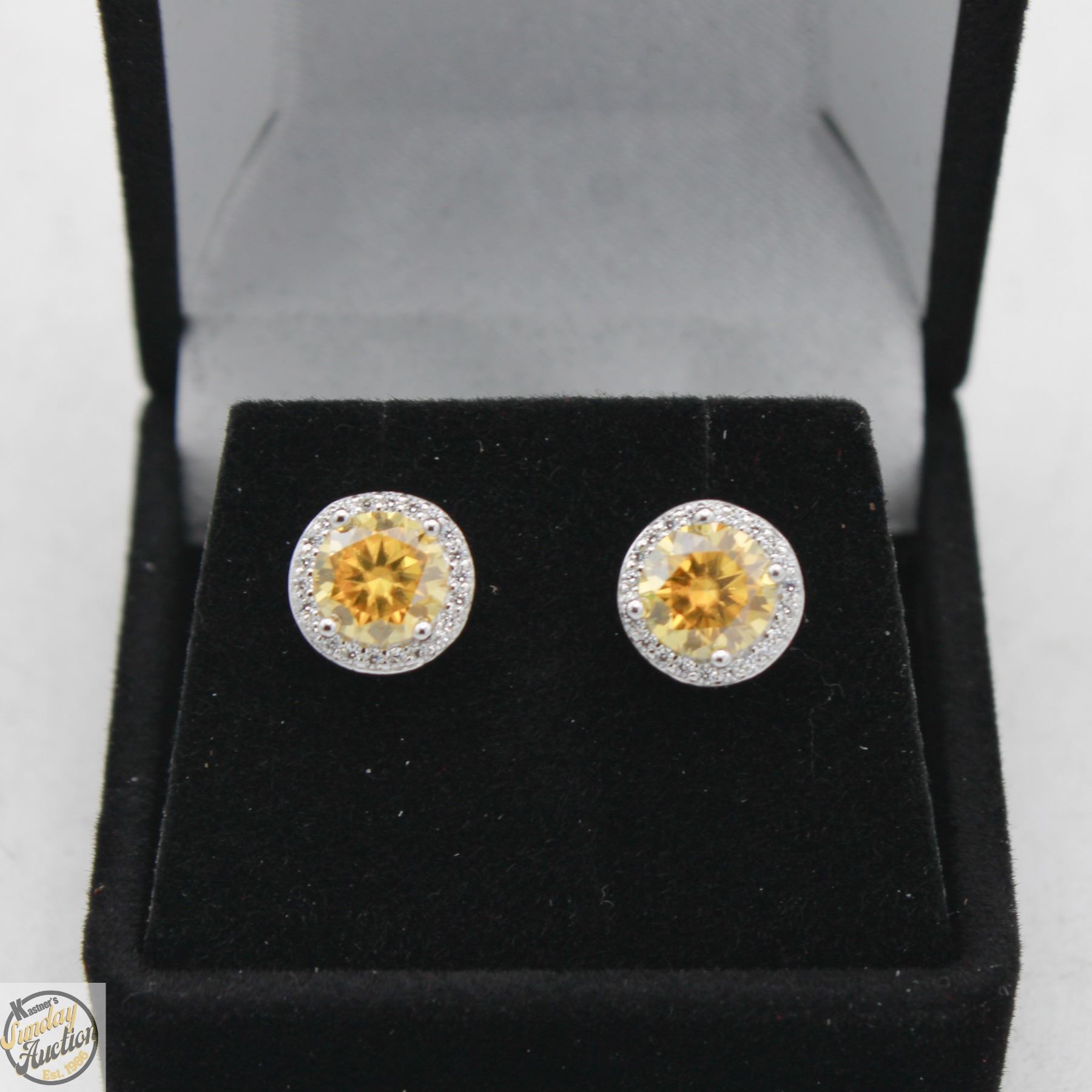 MOISSANITE STONE VVS FANCY YELLOW COLOR SET WITH 40 ROUND BRILLIANT CUT CUBIC ZIRCONIA SET IN ROUND HALO SET IN 925 SILVER EARRING RETAIL VALUE $950.00 **ALL ITEMS MUST BE REMOVED BY 5PM SATURDAY, DECEMBER 6TH 2025. ALL REMAINING ITEMS WILL BE SUBJECT TO A $6.00 PER DAY STORAGE CHARGE. ANY ITEMS REMAINING AFTER MONDAY, DECEMBER 22ND 2025 WILL BE CONSIDERED FORFEITED. NO REFUNDS WILL BE ISSUED FOR FORFEITED ITEMS. TO SCHEDULE A PICK UP APPOINTMENT CLICK HERE
