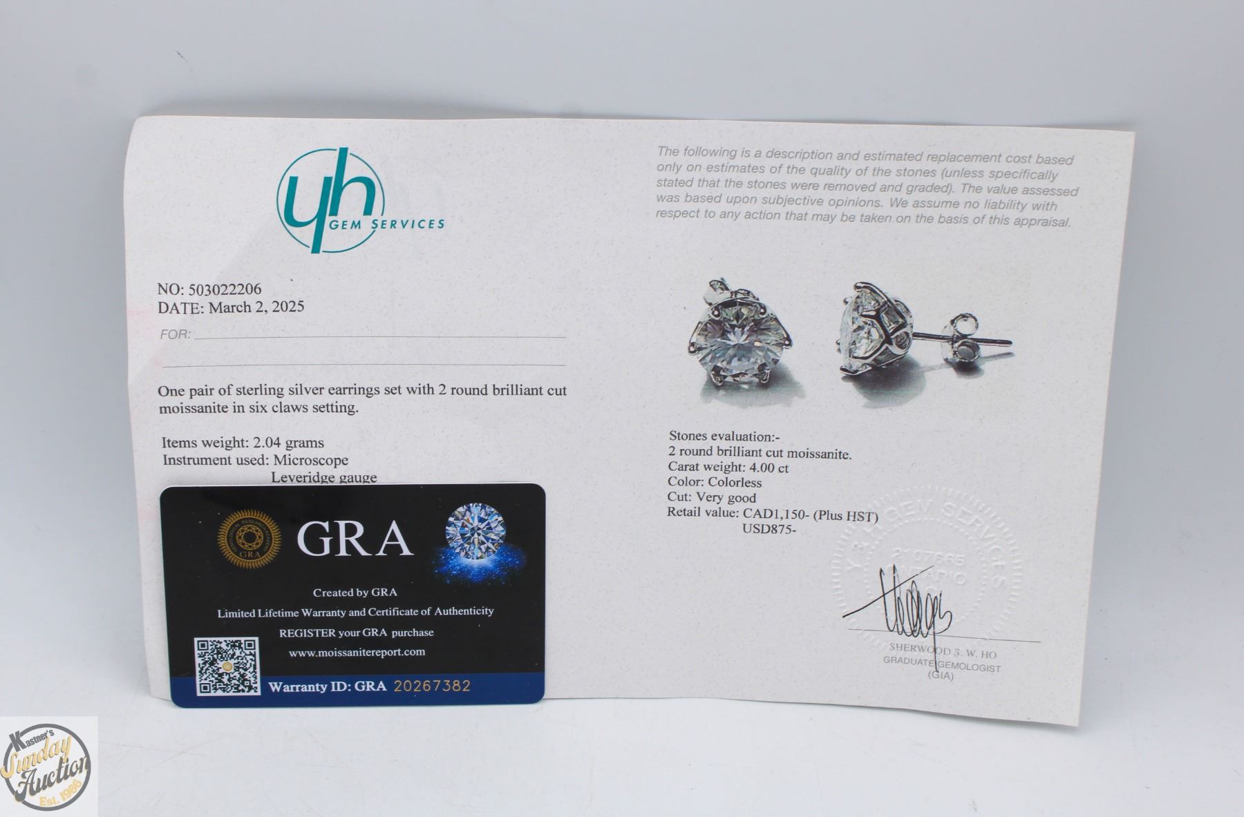 MOISSANITE STONES VVS D COLOR SET IN 6 CLAW FILAGREE BASKET HEAD SET IN 925 SILVER EARRINGS RETAIL VALUE $1,150.00 **ALL ITEMS MUST BE REMOVED BY 5PM SATURDAY, DECEMBER 6TH 2025. ALL REMAINING ITEMS WILL BE SUBJECT TO A $6.00 PER DAY STORAGE CHARGE. ANY ITEMS REMAINING AFTER MONDAY, DECEMBER 22ND 2025 WILL BE CONSIDERED FORFEITED. NO REFUNDS WILL BE ISSUED FOR FORFEITED ITEMS. TO SCHEDULE A PICK UP APPOINTMENT CLICK HERE