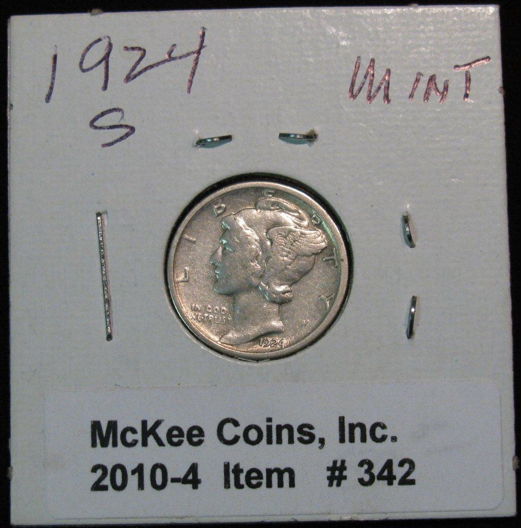 342. 1924 S Mercury Dime. VF-EF. Redbook $45 in EF.