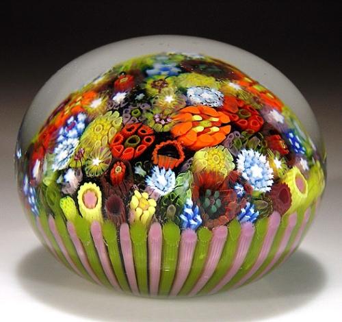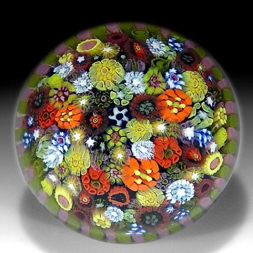 Drew Ebelhare 1992 close packed millefiori paperweight, with a colorful array of assorted complex canes, in a pink and green stave basket. Signed/dated. Diameter 2 3/8". NO RESERVE