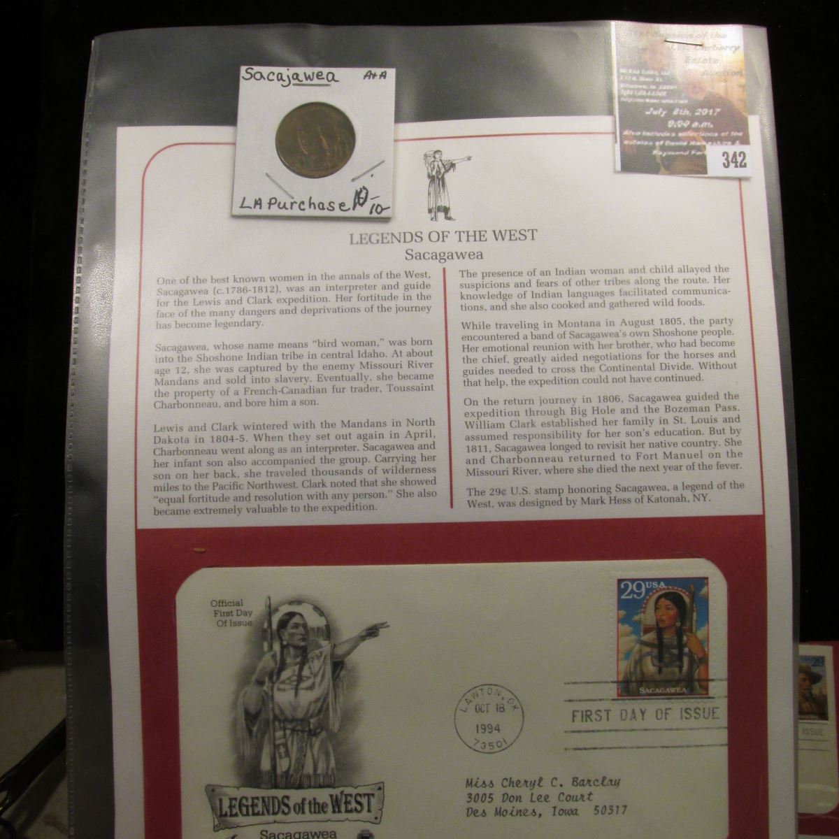 342."Sacajawea Louisiana Purchase" Medal and 1994 First Day of Issue Stamped and postmarked Cover.