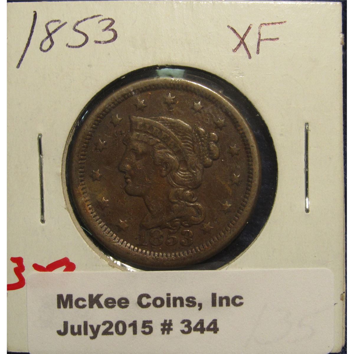 344. 1853 U.S. Large Cent. VF-EF.