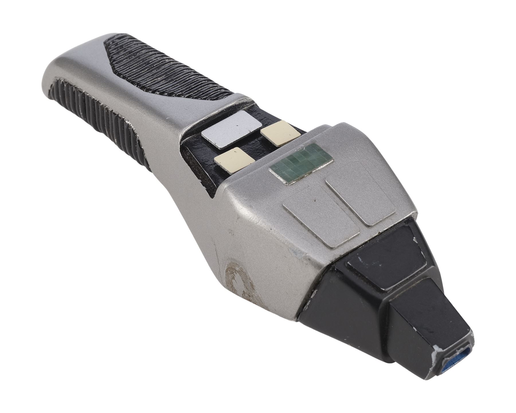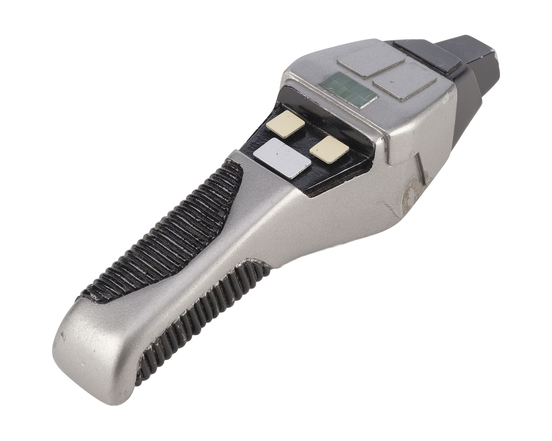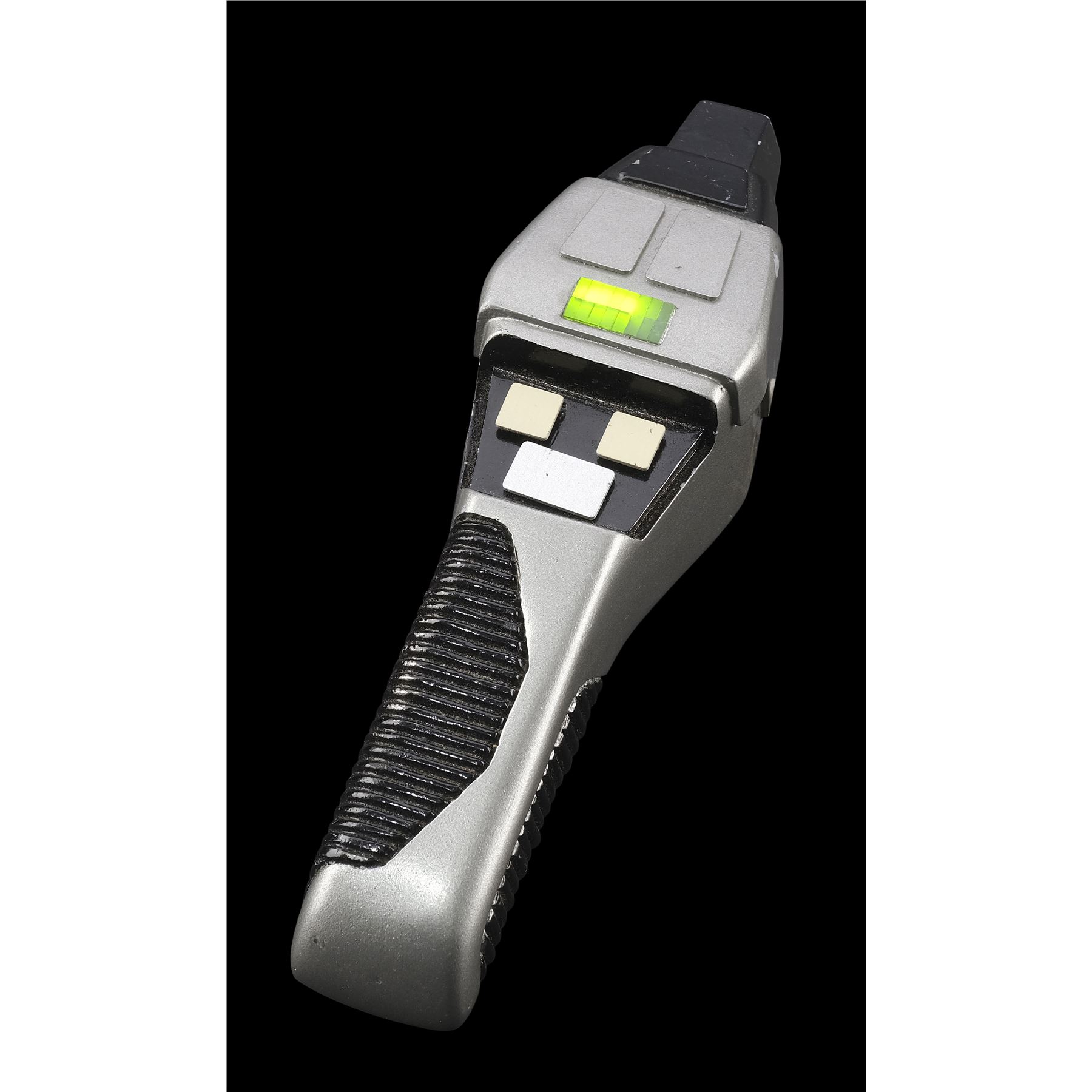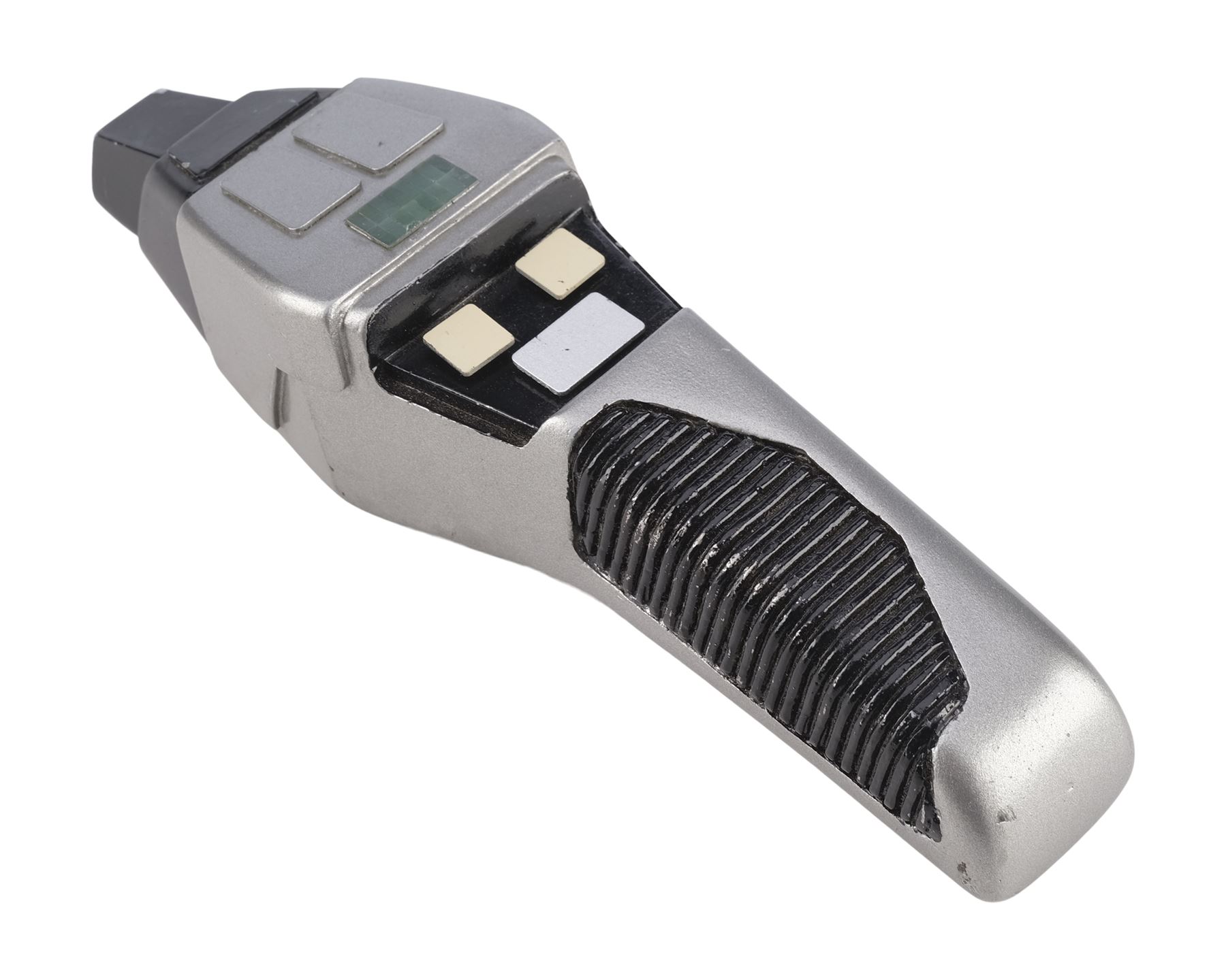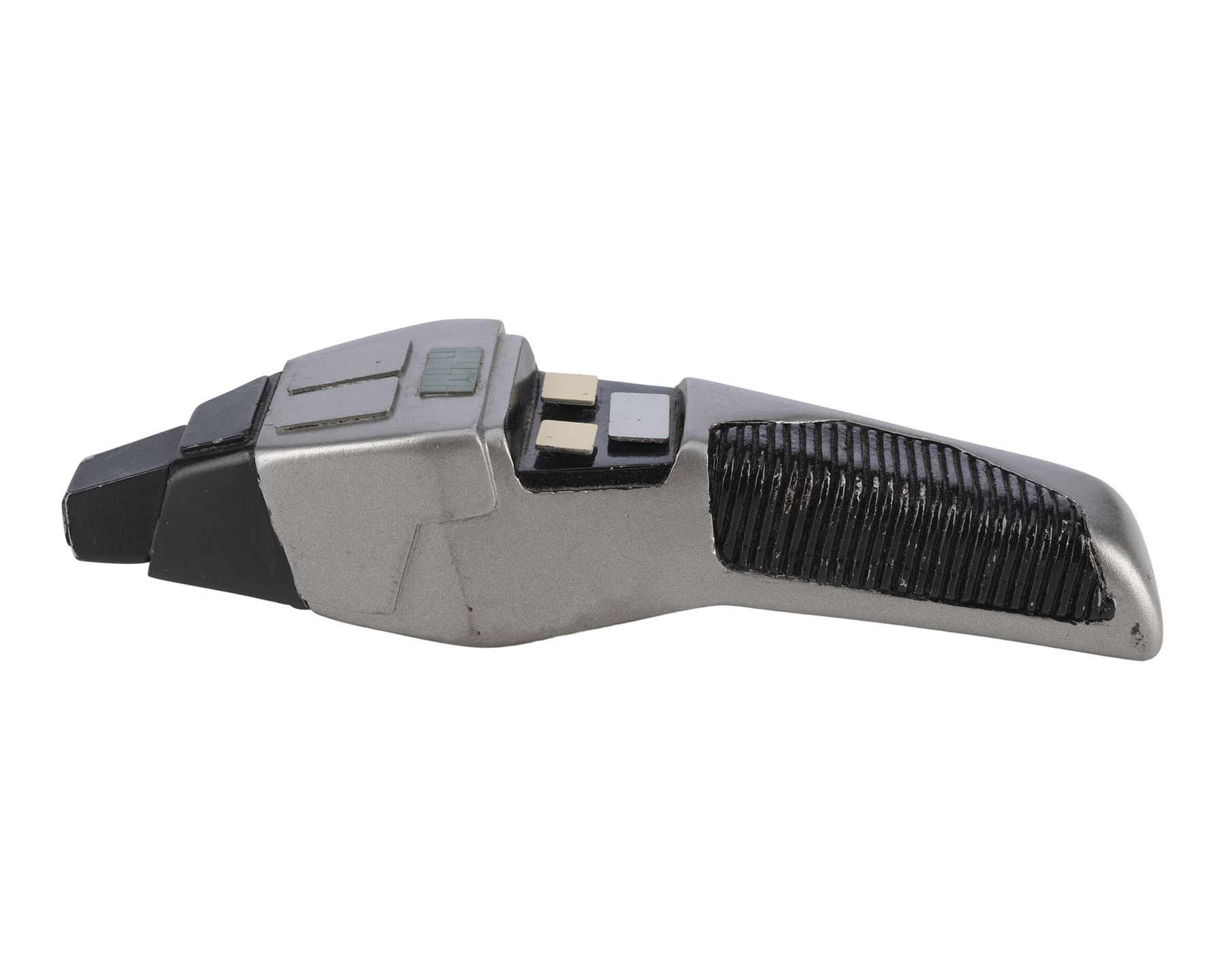 This black and silver-color resin phaser features a sharper angular design giving the impression of a "cobra" hood, as well as a grooved handle and power window. The phaser is activated by a small switch on the underside with a red dot indicating which side is "on." The top two buttons increase and decrease the "power" indicated on the small window. The buttons are replicas added after production to replace the lost originals. In addition to the buttons, the phaser exhibits a missing panel, scuffs, and scratches to the paint finish. Dimensions: 8" x 2.25" x 2.75" (20.5 cm x 5.5 cm x 7 cm)
