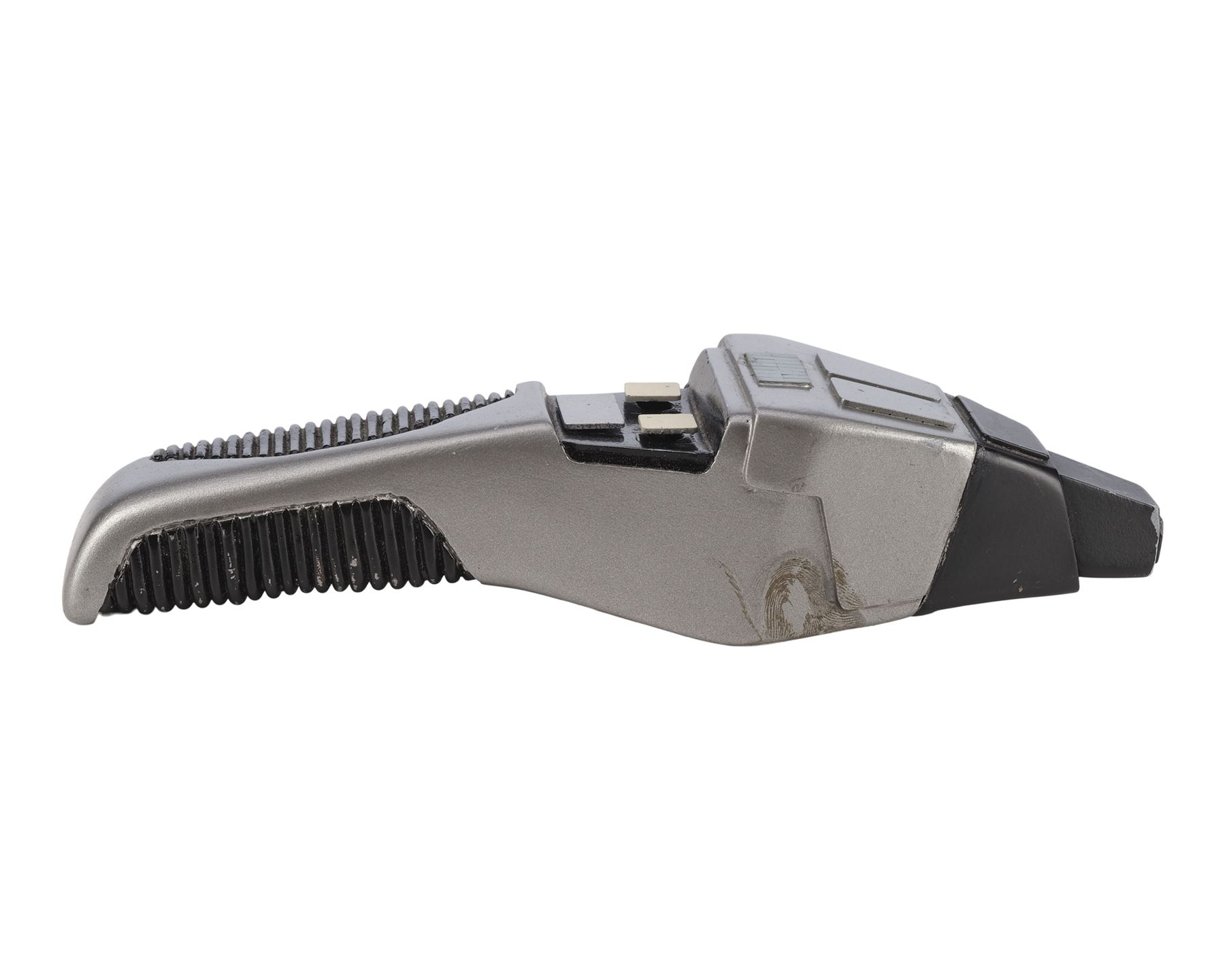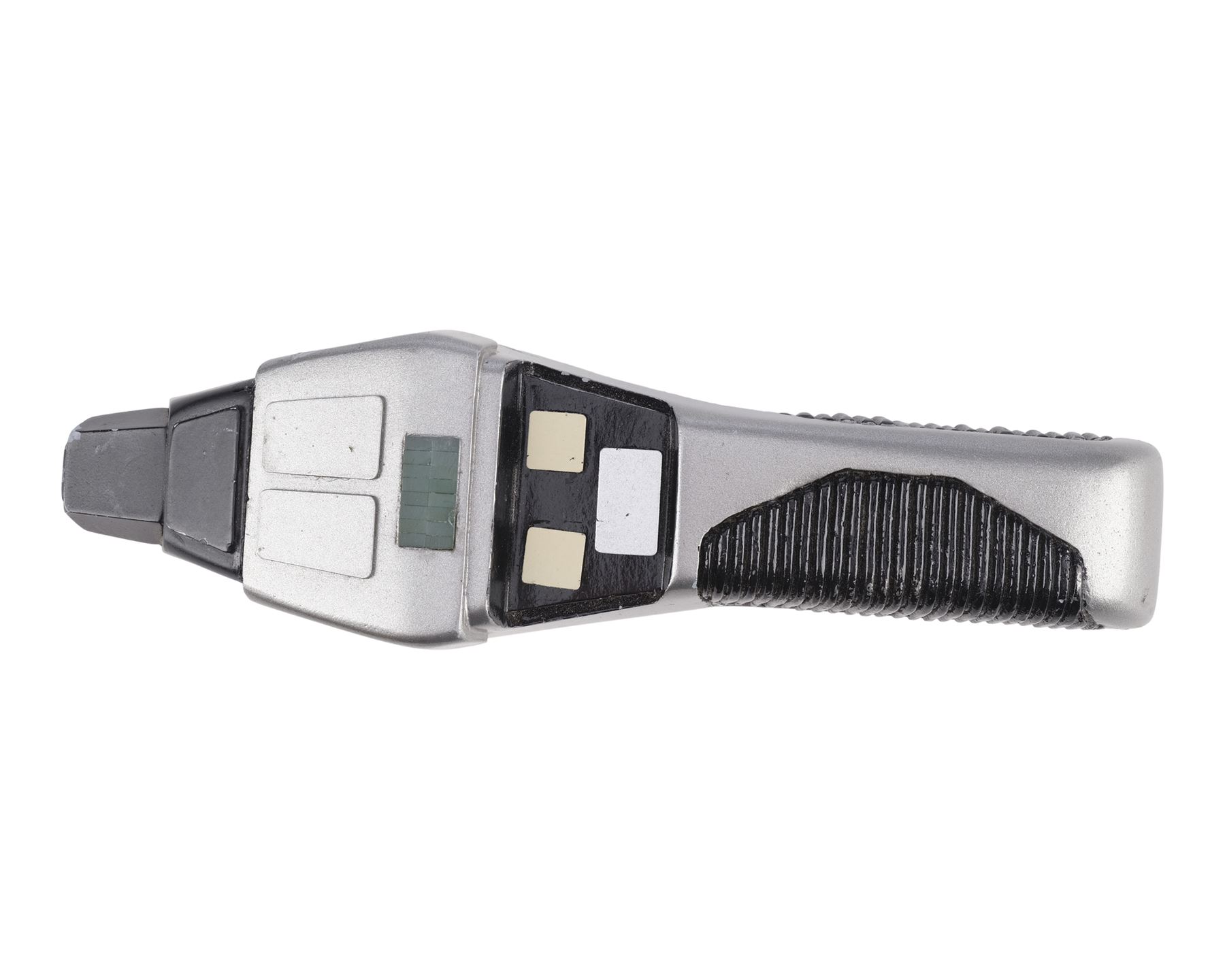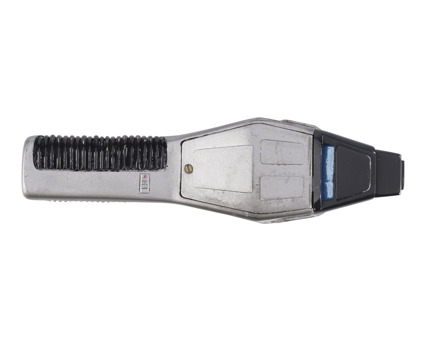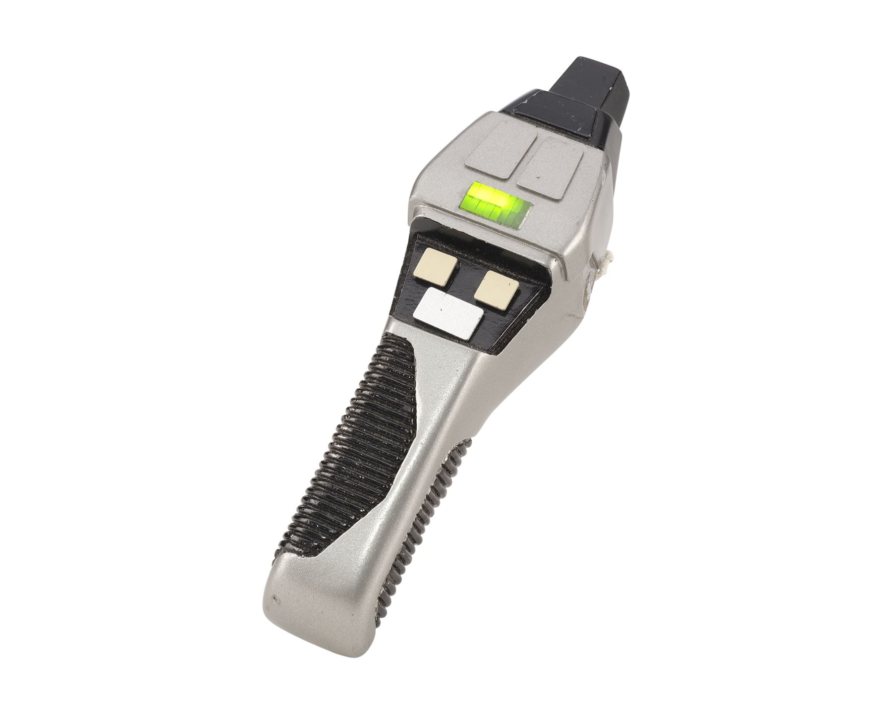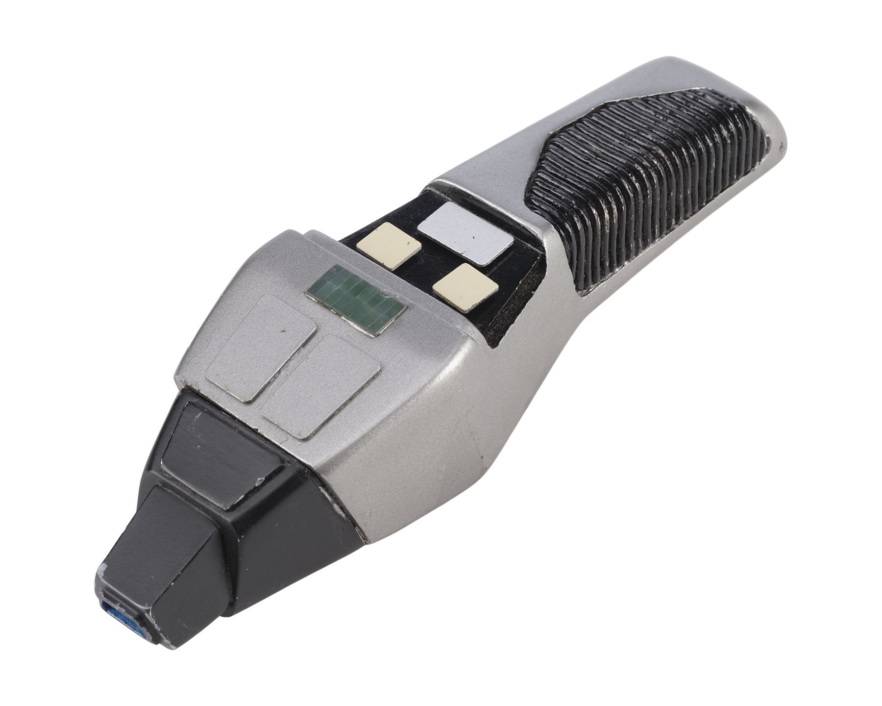 This black and silver-color resin phaser features a sharper angular design giving the impression of a "cobra" hood, as well as a grooved handle and power window. The phaser is activated by a small switch on the underside with a red dot indicating which side is "on." The top two buttons increase and decrease the "power" indicated on the small window. The buttons are replicas added after production to replace the lost originals. In addition to the buttons, the phaser exhibits a missing panel, scuffs, and scratches to the paint finish. Dimensions: 8" x 2.25" x 2.75" (20.5 cm x 5.5 cm x 7 cm)