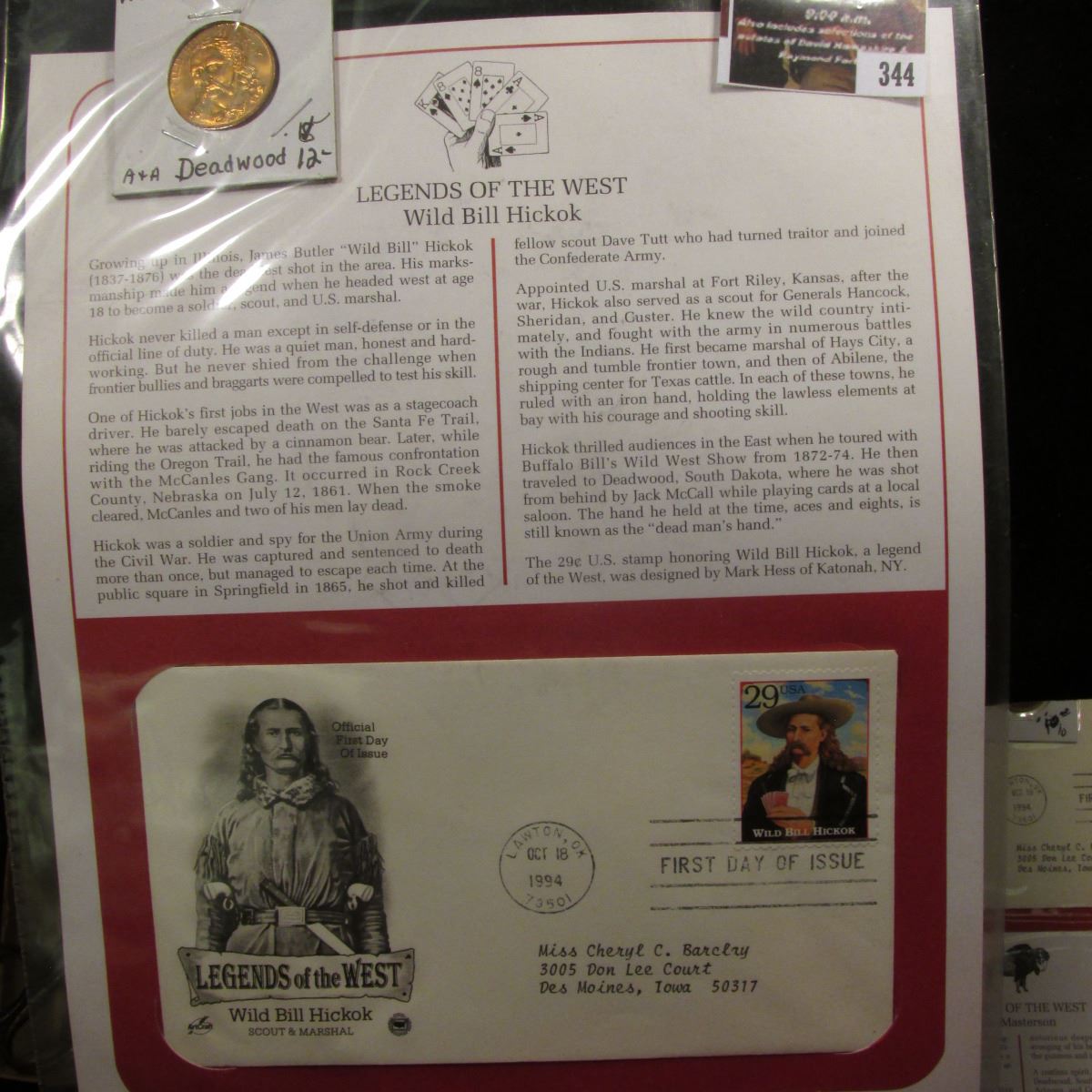 344."Wild Bill Hickok" Medal and 1994 First Day of Issue Stamped and postmarked Cover.