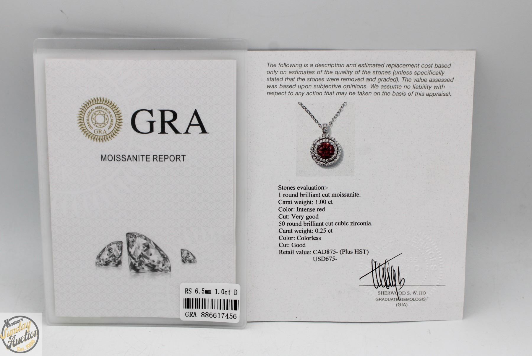 CUT MOISSANITE STONE VVS INTENSE RED COLOR WITH 50 ROUND BRILLIANT CUT CUBIC ZIRCONIA SET DUAL HALOS AROUND CENTER WITH SOME IN BALE SET IN 925 SILVER PENDANT RETAIL VALUE $875.00 **ALL ITEMS MUST BE REMOVED BY 5PM SATURDAY, NOVEMBER 1ST 2025. ALL REMAINING ITEMS WILL BE SUBJECT TO A $6.00 PER DAY STORAGE CHARGE. ANY ITEMS REMAINING AFTER MONDAY, NOVEMBER 17TH 2025 WILL BE CONSIDERED FORFEITED. NO REFUNDS WILL BE ISSUED FOR FORFEITED ITEMS. TO SCHEDULE A PICK UP APPOINTMENT CLICK HERE