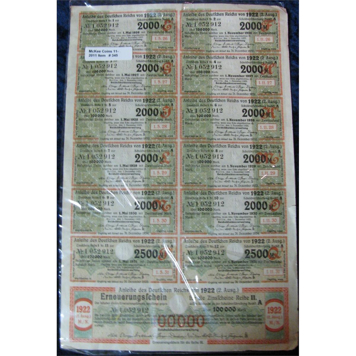 345. 1922 $100,000 Mark German Bond with Coupons. Uncut.