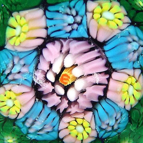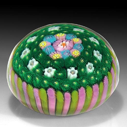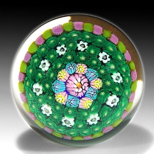 Drew Ebelhare 1993 moss ground millefiori paperweight, containing a central "E" signature cane, encircled by a ring of pink and blue canes, on green moss ground, which is studded with a spaced ring of white cogs. The arrangement rests within a pink and green stave basket. Signed/dated. Diameter 2". NO RESERVE