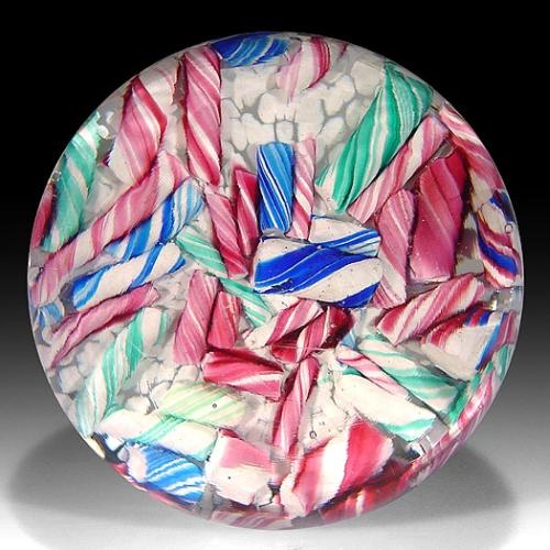 Edward Rithner "candy cane" paperweight, with short sections of blue, red, and turquoise-striped white rods, resting on speckled white ground. Diameter 3 1/4". NO RESERVE