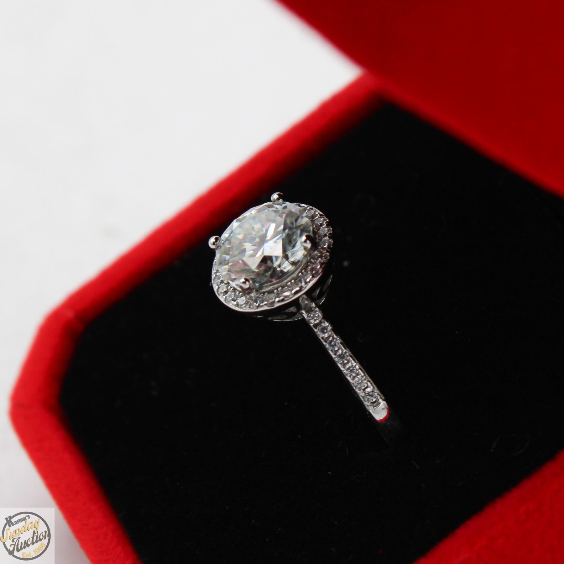 CUT MOISSANITE STONE VVS D COLOR WITH 35 ROUND BRILLIANT CUT CUBIC ZIRCONIA SET IN ROUND HALO AND SHANKS SET IN 925 SILVER RING SIZE ADJUSTABLE RETAIL VALUE $1,150.00 **ALL ITEMS MUST BE REMOVED BY 5PM SATURDAY, NOVEMBER 1ST 2025. ALL REMAINING ITEMS WILL BE SUBJECT TO A $6.00 PER DAY STORAGE CHARGE. ANY ITEMS REMAINING AFTER MONDAY, NOVEMBER 17TH 2025 WILL BE CONSIDERED FORFEITED. NO REFUNDS WILL BE ISSUED FOR FORFEITED ITEMS. TO SCHEDULE A PICK UP APPOINTMENT CLICK HERE