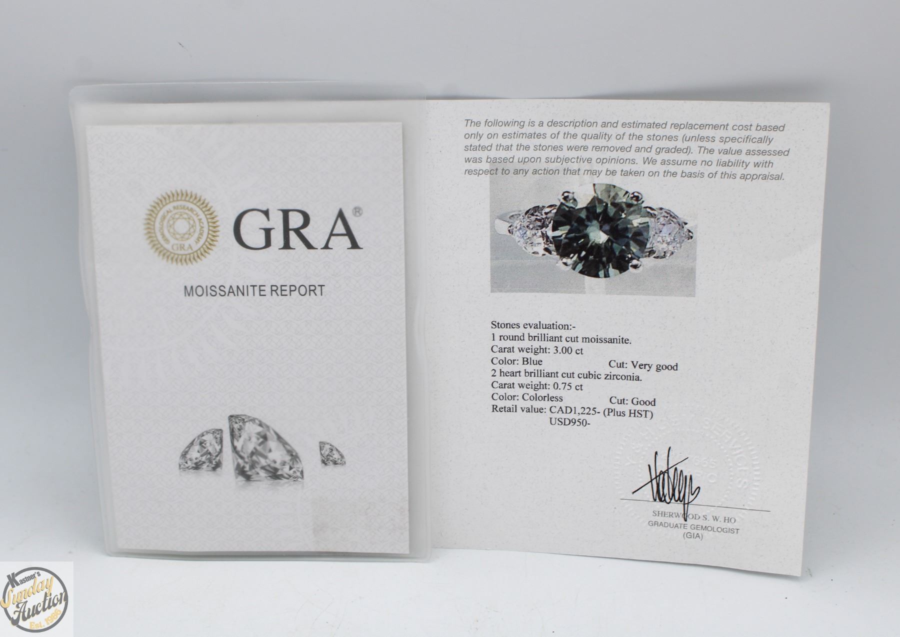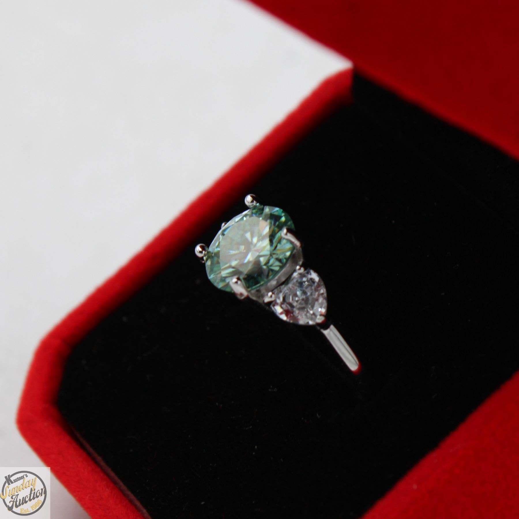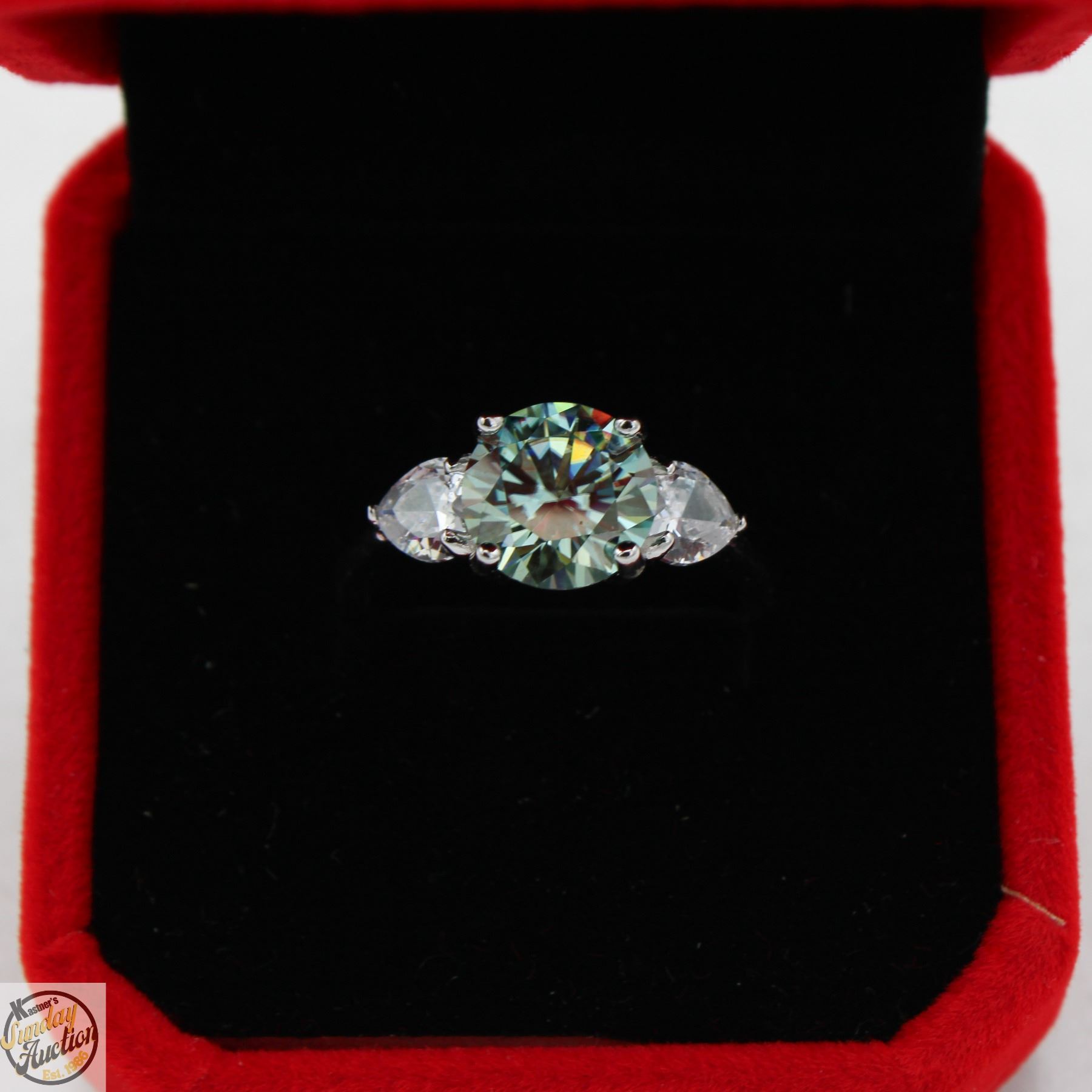 CUT MOISSANITE STONE VVS BLUE COLOR SET IN CENTER WITH HEART SHAPED BRILLIANT CUT CUBIC ZIRCONIA SET ON EITHER SIDE SET IN 925 SILVER RING SIZE 8 RETAIL VALUE $1,225.00 **ALL ITEMS MUST BE REMOVED BY 5PM SATURDAY, NOVEMBER 1ST 2025. ALL REMAINING ITEMS WILL BE SUBJECT TO A $6.00 PER DAY STORAGE CHARGE. ANY ITEMS REMAINING AFTER MONDAY, NOVEMBER 17TH 2025 WILL BE CONSIDERED FORFEITED. NO REFUNDS WILL BE ISSUED FOR FORFEITED ITEMS. TO SCHEDULE A PICK UP APPOINTMENT CLICK HERE