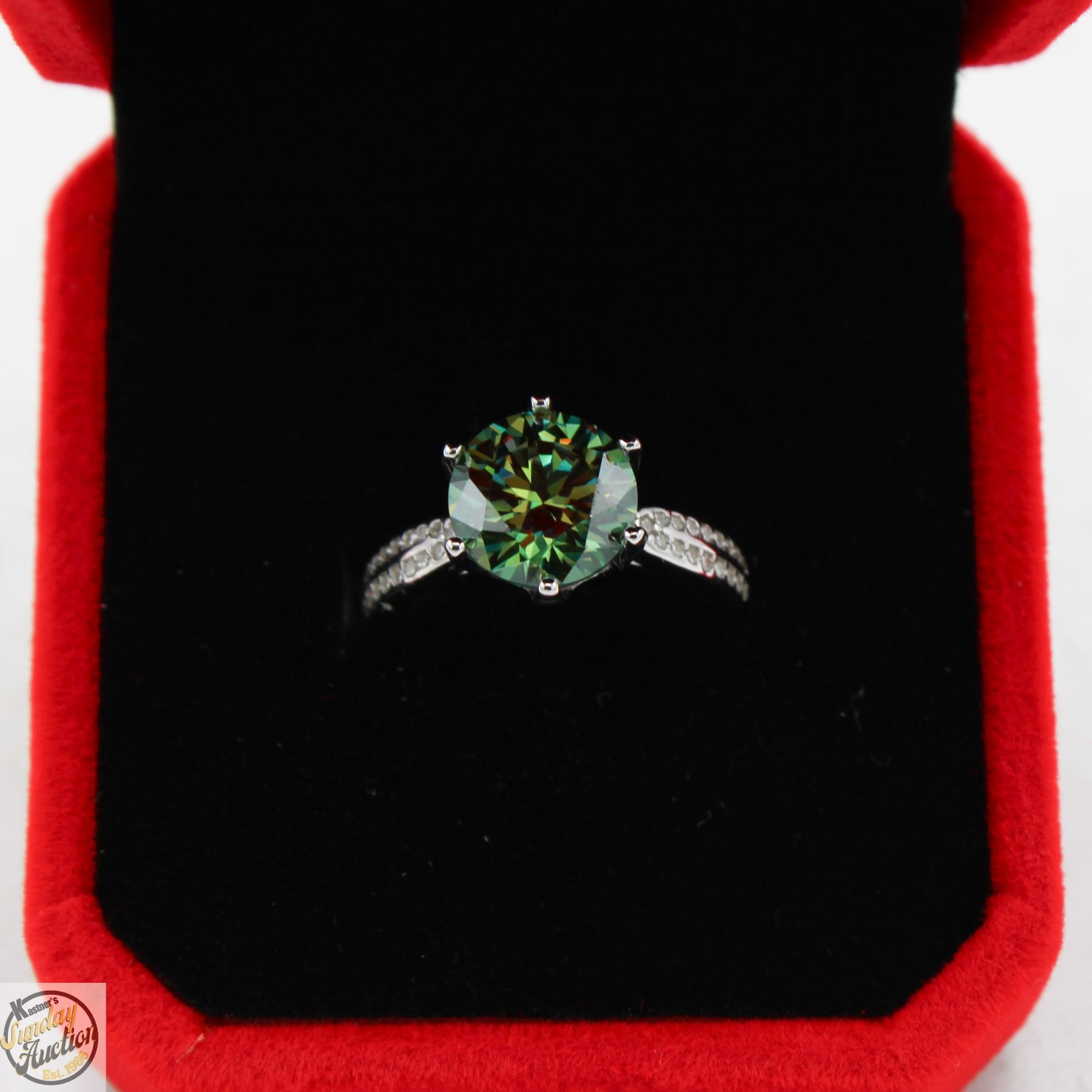 CUT MOISSANITE STONE VVS BLUISH GREEN COLOR WITH 34 ROUND BRILLIANT CUT CUBIC ZIRCONIA SET IN SHANKS SET IN 925 SILVER RING SIZE 6 RETAIL VALUE $1,275.00 **ALL ITEMS MUST BE REMOVED BY 5PM SATURDAY, NOVEMBER 1ST 2025. ALL REMAINING ITEMS WILL BE SUBJECT TO A $6.00 PER DAY STORAGE CHARGE. ANY ITEMS REMAINING AFTER MONDAY, NOVEMBER 17TH 2025 WILL BE CONSIDERED FORFEITED. NO REFUNDS WILL BE ISSUED FOR FORFEITED ITEMS. TO SCHEDULE A PICK UP APPOINTMENT CLICK HERE
