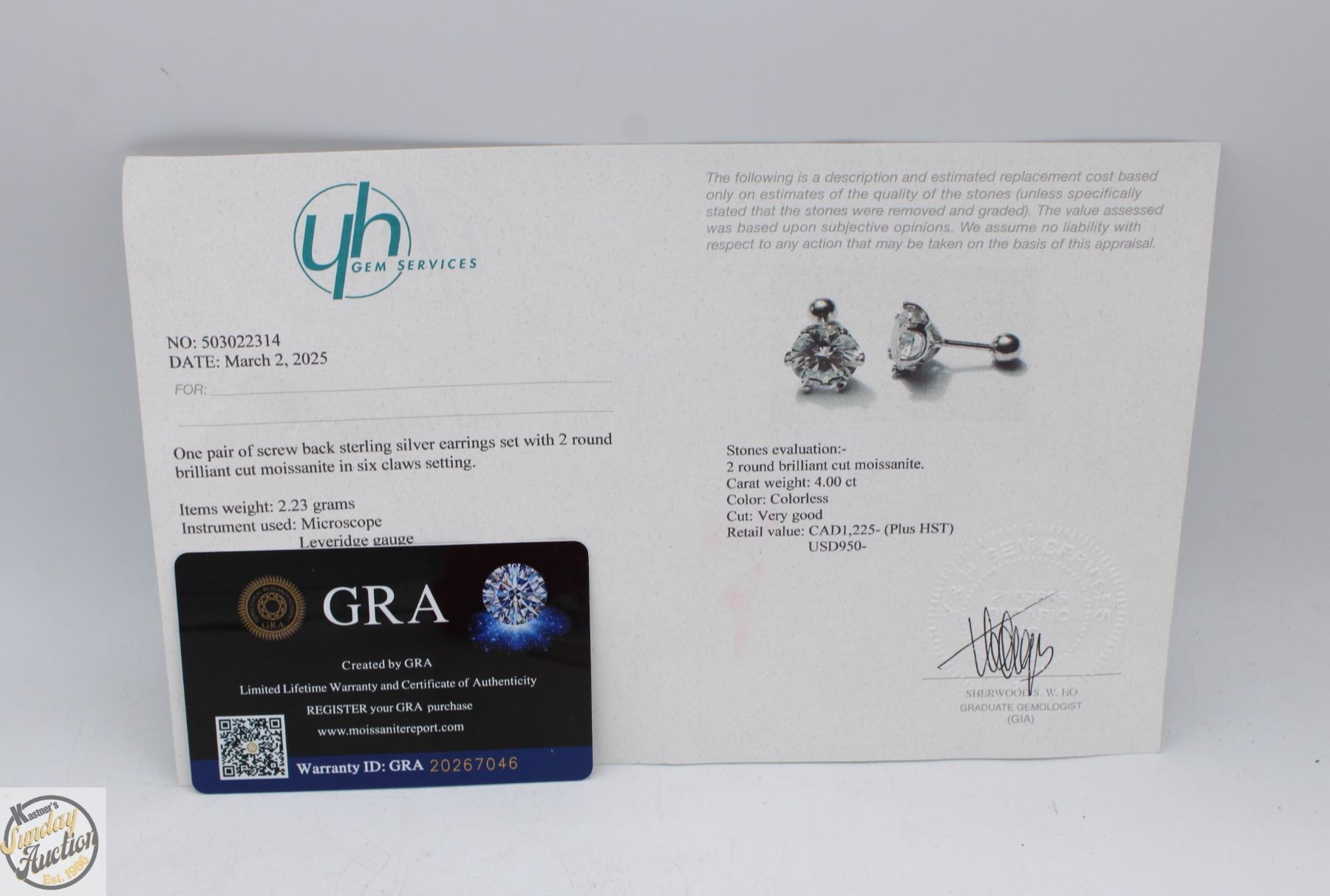 CUT MOISSANITE STONES VVS D COLOR SET IN 6 CLAW FILAGREE HEAD SET IN 925 SILVER EARRINGS WITH SCREW BACKS RETAIL VALUE $1,225.00 **ALL ITEMS MUST BE REMOVED BY 5PM SATURDAY, NOVEMBER 1ST 2025. ALL REMAINING ITEMS WILL BE SUBJECT TO A $6.00 PER DAY STORAGE CHARGE. ANY ITEMS REMAINING AFTER MONDAY, NOVEMBER 17TH 2025 WILL BE CONSIDERED FORFEITED. NO REFUNDS WILL BE ISSUED FOR FORFEITED ITEMS. TO SCHEDULE A PICK UP APPOINTMENT CLICK HERE