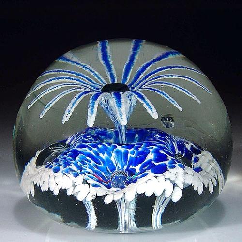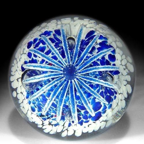 Edward Rithner blue and white flower paperweight, containing a central upright sixteen-petal flower, growing from a blue-speckled white ground, with a ring of four spaced bubbles. The ground is indented under the flower and under each of the bubbles. Unpolished base. Diameter 3". NO RESERVE