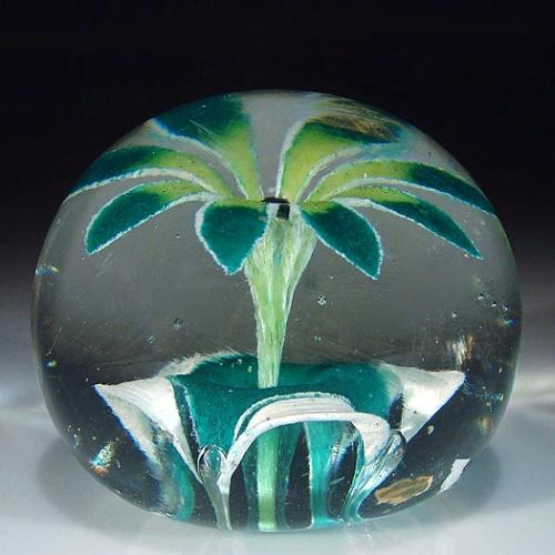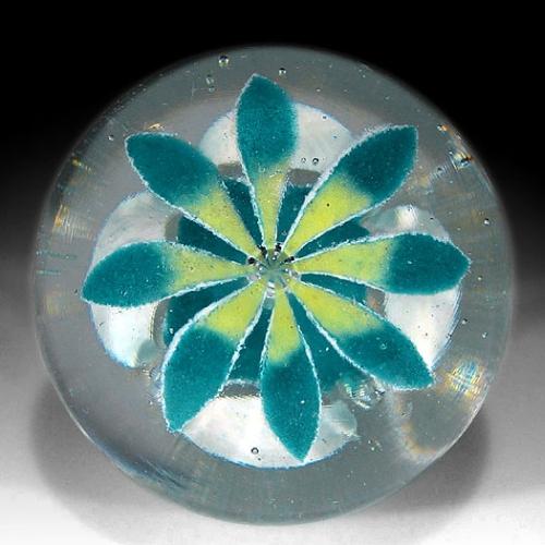 Edward Rithner flower in a pot paperweight, containing an upright flower, with eight teal-tipped pale yellow petals, growing from a teal flower pot, bordered by rows of arched white bands. Diameter 3 1/8". NO RESERVE