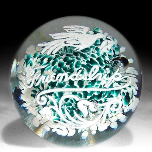 Edward Rithner motto paperweight, depicting a white dove, flowers, and the word, "Friendship", in white script, over a teal-speckled white ground, with four spaced bubbles punctuating the border. Diameter 3 1/4". NO RESERVE