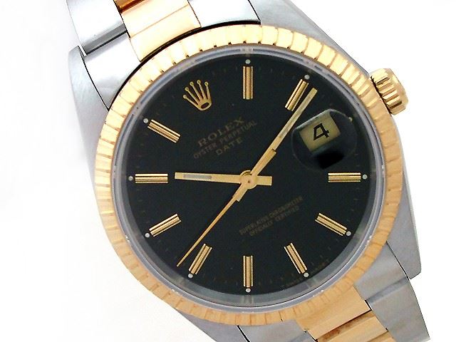 34mm Midsize Rolex 18k Gold & Stainless Steel Oyster Perpetual Date Watch. Black Dial. 18k Yellow Gold Fluted Bezel. 18k Gold & Stainless Steel Oyster Band. Style 15233/32552
