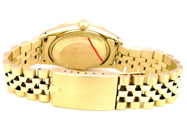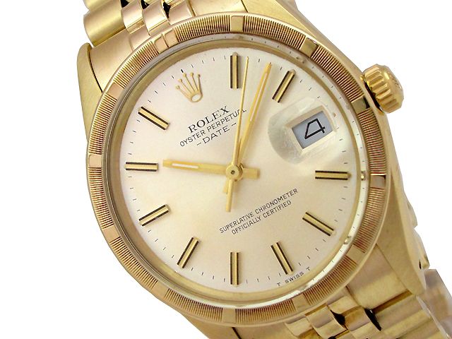 34mm Rolex 14K Yellow Gold Oyster Perpetual Date Watch. Silver Roman Numeral Dial. 14k Yellow Gold Engine Turned Bezel. 14K Yellow Gold Jubilee Band. Style 15017.