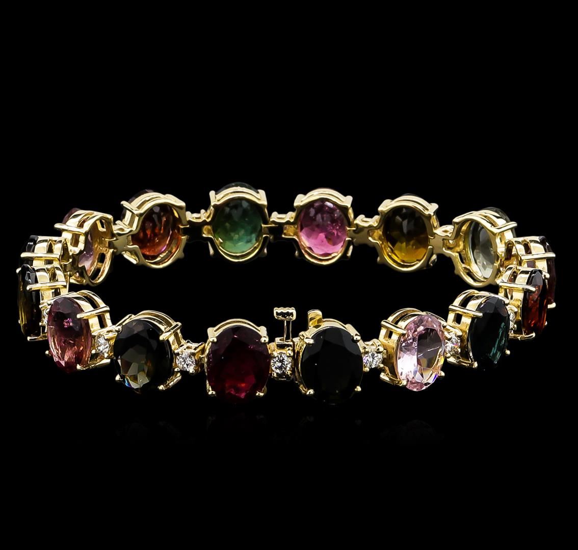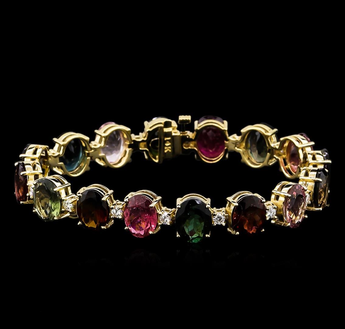 One electronically tested 14KT yellow gold lady's combination cast & assembled fashion bracelet with a tongue clasp with foldover safety with a bright polish finish. The featured lady's bracelet measures 7 inches in length. Identified with markings of "14K". Condition is new, good workmanship. Containing: Sixteen prong set oval modified brilliant cut natural multi-color tourmalines, measuring 9.95 x 7.50 x 4.56mm, approximate total weight of 35.00ct., clarity is eye clean, type II, cut is good. The featured tourmalines range in color from green to greenish orange to orangish red to pink. Colored gemstones are presumed to have been subjected to commonly used enhancement processes. Graded in the setting. Sixteen prong set round brilliant cut diamonds, measuring 2.60 - 2.50 x 1.58mm (depth est.) approximate total weight of 16 Stones = 1.00ct. Graded in the setting. Clarity: VS-2 to SI-2. Color: G - I. Cut Very Good. Total Weight of Colored Stones 35.00ct. Total Weight of Diamonds 1.00ct. Total Weight of Bracelet 23.50gm. GAS Appraised at $8,905.00.