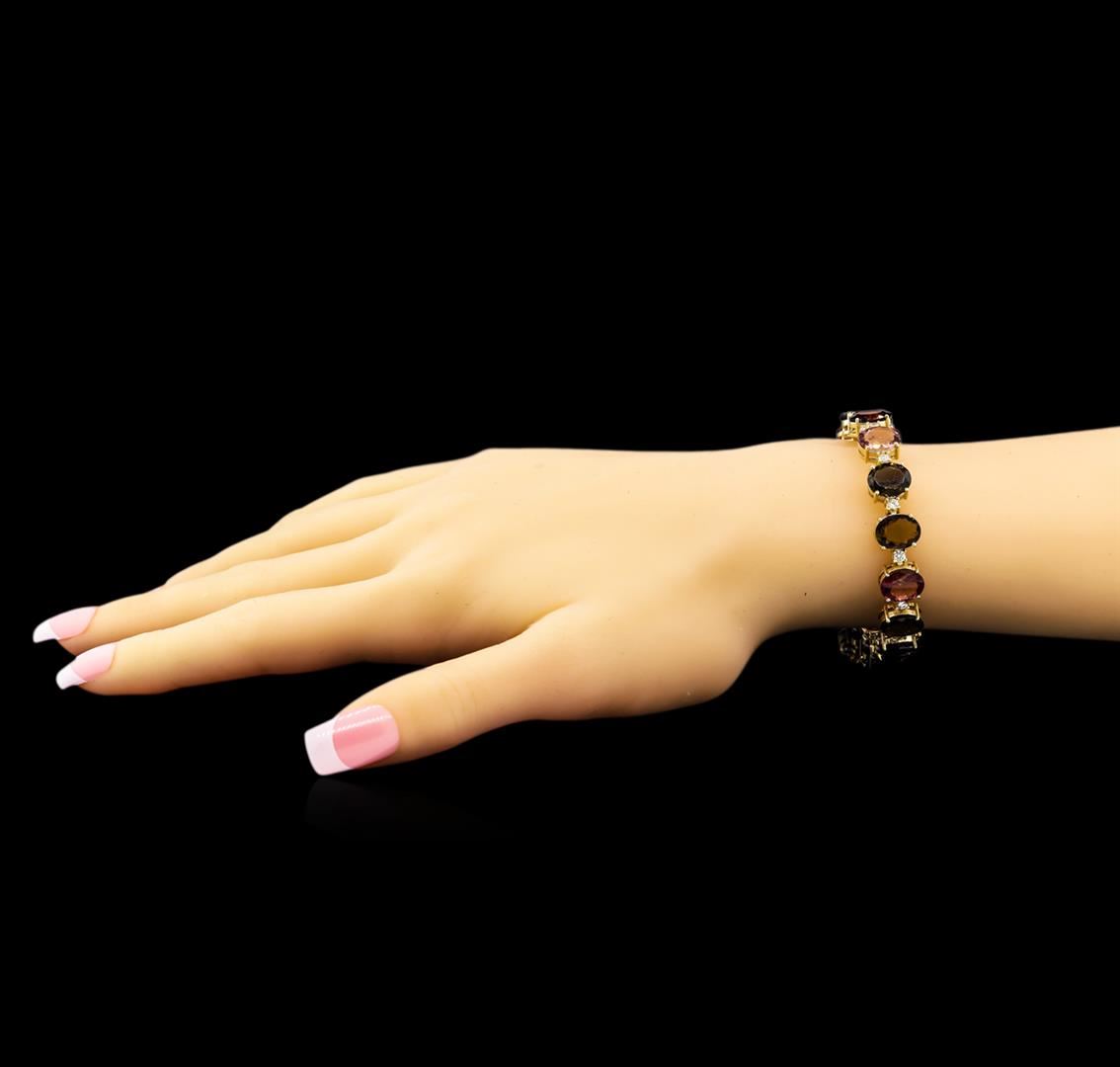 One electronically tested 14KT yellow gold lady's combination cast & assembled fashion bracelet with a tongue clasp with foldover safety with a bright polish finish. The featured lady's bracelet measures 7 inches in length. Identified with markings of "14K". Condition is new, good workmanship. Containing: Sixteen prong set oval modified brilliant cut natural multi-color tourmalines, measuring 9.95 x 7.50 x 4.56mm, approximate total weight of 35.00ct., clarity is eye clean, type II, cut is good. The featured tourmalines range in color from green to greenish orange to orangish red to pink. Colored gemstones are presumed to have been subjected to commonly used enhancement processes. Graded in the setting. Sixteen prong set round brilliant cut diamonds, measuring 2.60 - 2.50 x 1.58mm (depth est.) approximate total weight of 16 Stones = 1.00ct. Graded in the setting. Clarity: VS-2 to SI-2. Color: G - I. Cut Very Good. Total Weight of Colored Stones 35.00ct. Total Weight of Diamonds 1.00ct. Total Weight of Bracelet 23.50gm. GAS Appraised at $8,905.00.