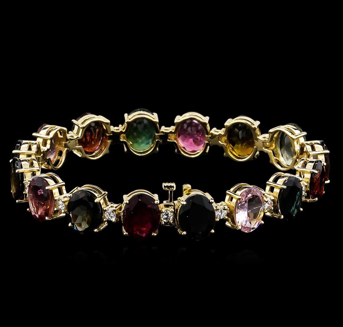 One electronically tested 14KT yellow gold lady's combination cast & assembled fashion bracelet with a tongue clasp with foldover safety with a bright polish finish. The featured lady's bracelet measures 7 inches in length. Identified with markings of "14K". Condition is new, good workmanship. Containing: Sixteen prong set oval modified brilliant cut natural multi-color tourmalines, measuring 9.95 x 7.50 x 4.56mm, approximate total weight of 35.00ct., clarity is eye clean, type II, cut is good. The featured tourmalines range in color from green to greenish orange to orangish red to pink. Colored gemstones are presumed to have been subjected to commonly used enhancement processes. Graded in the setting. Sixteen prong set round brilliant cut diamonds, measuring 2.60 - 2.50 x 1.58mm (depth est.) approximate total weight of 16 Stones = 1.00ct. Graded in the setting. Clarity: VS-2 to SI-2. Color: G - I. Cut Very Good. Total Weight of Colored Stones 35.00ct. Total Weight of Diamonds 1.00ct. Total Weight of Bracelet 23.50gm. GAS Appraised.