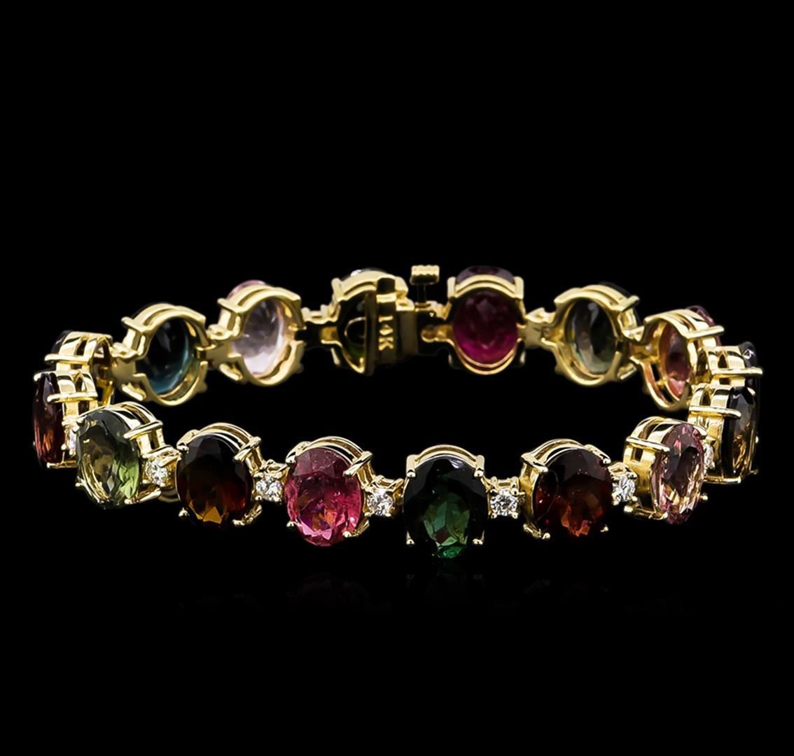 One electronically tested 14KT yellow gold lady's combination cast & assembled fashion bracelet with a tongue clasp with foldover safety with a bright polish finish. The featured lady's bracelet measures 7 inches in length. Identified with markings of "14K". Condition is new, good workmanship. Containing: Sixteen prong set oval modified brilliant cut natural multi-color tourmalines, measuring 9.95 x 7.50 x 4.56mm, approximate total weight of 35.00ct., clarity is eye clean, type II, cut is good. The featured tourmalines range in color from green to greenish orange to orangish red to pink. Colored gemstones are presumed to have been subjected to commonly used enhancement processes. Graded in the setting. Sixteen prong set round brilliant cut diamonds, measuring 2.60 - 2.50 x 1.58mm (depth est.) approximate total weight of 16 Stones = 1.00ct. Graded in the setting. Clarity: VS-2 to SI-2. Color: G - I. Cut Very Good. Total Weight of Colored Stones 35.00ct. Total Weight of Diamonds 1.00ct. Total Weight of Bracelet 23.50gm. GAS Appraised.