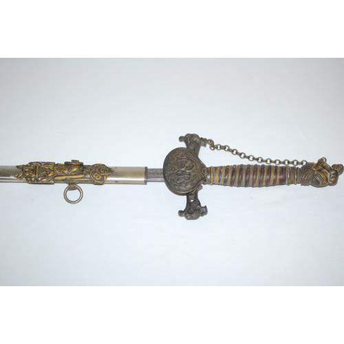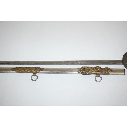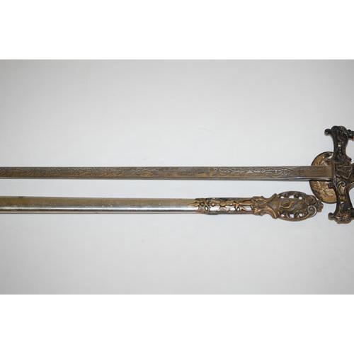 35 1/2" FRATERNAL SWORD - M.C. LILLEY & CO. COLUMBUS OH, NICKEL PLATED METAL SCABBARD W/ FCB SHIELD ETCHED DECORATED BLADE JAMES T. BLACK W/ BRASS FITTINGS & BROWN LEATHER GRIP W/ BRASS WRAP, HAND GUARDS ETC. - GOOD CONDITION, MINOR WEAR & IMPERFECTIONS
