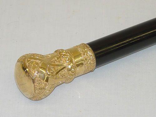 35 1/2" GOLD HANDLED WALKING CANE-HANDLE W/ BRIGHT CUT FLORAL DESIGN W/ INSCRIPTION A.A. HAWLEY XMAS 1884, UNMARKED